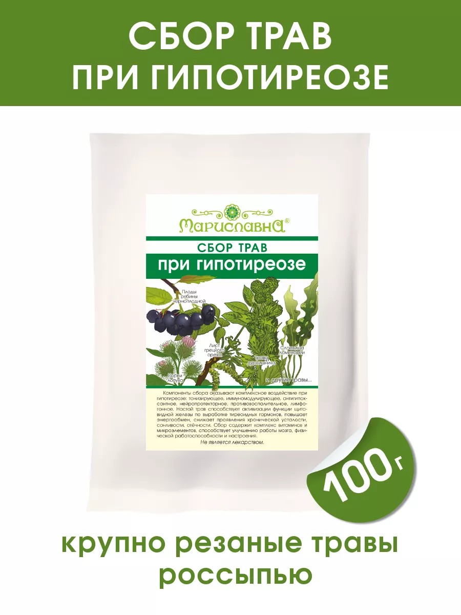 Сбор трав "При гипотиреозе" рекомендуется применять при сниженной функции щитовидной железы и гипотиреозе с целью повышения уровня энергии, обменных процессов, умственной и физической работоспособности. Состав: лист грецкого ореха, трава дypнишника, корни лопуха, корни цикория, плоды рябины черноплодной, слоевища ламинарии, трава звездчатки, трава зверобоя, лист чёрной смородины, хвоя сосны. Компоненты сбора оказывают комплексное воздействие при гипотиреозе: тонизирующее, иммуномодулирующее, антигипоксантное, нейропротекторное, противовоспалительное, лимфогонное. Настой трав способствует активизации функции щитовидной железы по выработке тиреоидных гормонов, повышает энергообмен, снижает проявления хронической усталости, сонливости, отёчности. Сбор содержит комплекс витаминов имикроэлементов, способствует улучшению работы мозга, физической работоспособности и настроения. Упаковка содержит 100 грамм травяной смеси россыпью, которой хватит примерно на 7 дней. На обороте бумажного пакета нанесена информация о составе и приготовлении. Противопоказания: беременность, лактация, индивидуальная непереносимость компонентов состава.