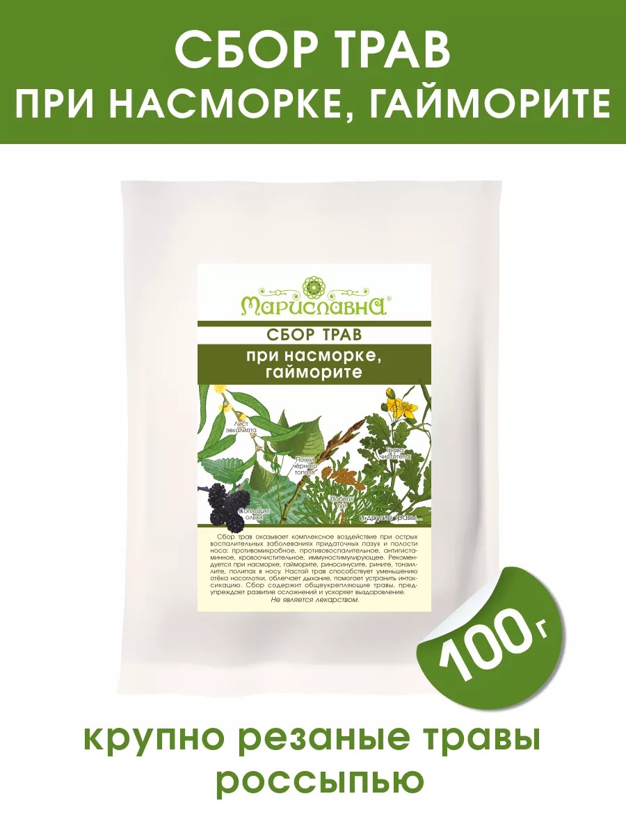 Сбор трав "При насморке, гайморите" рекомендуется при острых и хронических заболеваниях придаточных пазух и полости носа, насморке, гайморите, фронтите. Состав: лист берёзы, лист шaлфeя, лист эвкалипта, побеги туи западной, цветы аптечной ромашки, трава фиалки трехцветной, трава чистотeлa, почки чёрного тополя, соплодия ольхи, плоды шиповника. Компоненты сбора оказывают комплексное воздействие при насморке и синуситах: антибактериальное, противовирусное, противовоспалительное, противоаллергическое, противоотёчное, общеукрепляющее. Благодаря эфиромасличным и фитонцидным травам настой трав способствует устранению отёка и облегчению носового дыхания, препятствует заложенности носа и улучшает отхождение слизи. Сбор может применяться в домашних условиях при первых признаках обострения гайморита и при ОРВИ. Курс приёма 2-4 недели, до полного выздоровления. Рекомендуется сочетать с сопутствующими фитопрепаратами (каплями циклaмeна арт.66514445, Хвойным экстрактом арт.73577732, сиропом "Прополисным" арт.71669622 и другими). Упаковка содержит 100 грамм травяной смеси россыпью, которой хватит примерно на 10-12 дней. На обороте бумажного пакета нанесена информация о составе и приготовлении. Противопоказания: беременность, лактация, детский возраст до 7 лет, индивидуальная непереносимость компонентов состава.