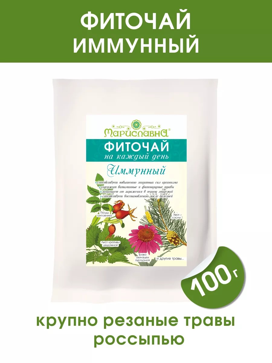 Фиточай "Иммунный" рекомендуется для ежедневного употребления с целью общего оздоровления организма, для профилактики вирусных инфекций и в период восстановления после перенесённых заболеваний. Состав: плоды шиповника, трава зверобоя, трава эхинацеи пурпурной, хвоя сосны, лист крапивы двудомной, трава топинамбура, трава чабреца, лист смородины чёрной, лист земляники, лист облепихи, лист алычи, лист груши, лист яблони. Компоненты сбора являются источниками витаминов, флавоноидов, фитонцидов и других ценных соединений. Травяной чай способствует повышению защитных сил организма, способствует скорейшему выздоровлению при ОРВИ и восстановлению после перенесённых болезней, полезен при анемии, хронической усталости, физическом переутомлении, тяжёлых умственных нагрузках. Травяной чай - это идеальный напиток для ежедневного употребления, он не содержит кофеина и не травмирует нервную систему. Чай не содержит сильнодействующих и горьких трав, может применяться детьми школьного возраста, а также при лактации. При беременности рекомендуется проконсультироваться с врачом. Общеукрепляющий травяной чай может стать прекрасным подарком родным и близким в любой праздник или без повода. Упаковка содержит 100 грамм травяной смеси россыпью, которой хватит примерно на 10 дней. На обороте бумажного пакета нанесена информация о составе и приготовлении. Противопоказания: индивидуальная непереносимость компонентов состава.