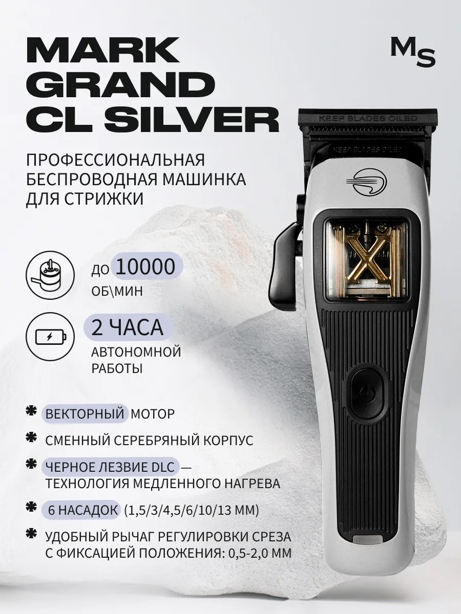 Introducing the Mark Shmidt Professional Grand hair clipper (gray replaceable housing) – your reliable assistant for creating the perfect look. This clipper is a true professional, equipped with a patented long-lasting vector motor that operates at up to 10,000 rpm. The powerful 8-watt motor effortlessly handles any hair thickness. The DLS blade with slow-heating technology ensures a smooth and comfortable cut without irritating the skin. Thanks to a 2500 mAh lithium battery, the clipper runs for up to 2 hours on a single charge, allowing you to perform numerous haircuts without interruption. The cutting height adjustment lever and 6 attachments allow you to create a variety of hairstyles, from classic to the most fashionable. The Mark Shmidt Professional is the perfect combination of power, precision, and convenience that will be appreciated by both professionals and amateurs.