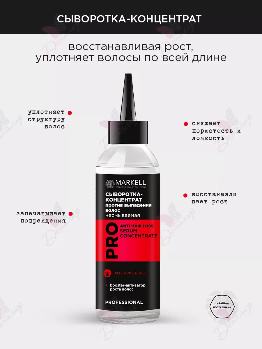 Сыворотка-концетрат против выпадения волос Professional. Инновационная формула сыворотки против выпадения волос от MARKELL эффективно противостоит выпадению волос: борется не только с их потерей, но и защищает от ломкости и ослабленности, а также обеспечивает оптимальные условия для роста здоровых и сильных волос. Рекомендовано для профессионального и домашнего использования. BIO-CAPIGEN VEG - мультифункциональный комплекс на основе аргинина, женьшеня, витаминов группы В и протеинов сои. Благодаря этому пролонгирует фазу активного роста волос, предупреждает их потерю и стимулирует рост. EXTRAPONE CASHMERE - гидролизованный кератин - восстанавливает структуру волос, снижает пористость и ломкость волос, придает волосам упругость и эластичность. ПАНТЕНОЛ восстанавливает волосы по всей длине, защищает их от агрессивных внешних воздействий, возвращает им жизненную силу и упругость. Активные компоненты: Гидролизованный соевый протеин, Пантенол, Zinc PCA, Ниацинамид, Аргинин, Экстракт красного лука, Гидролизованный кератин