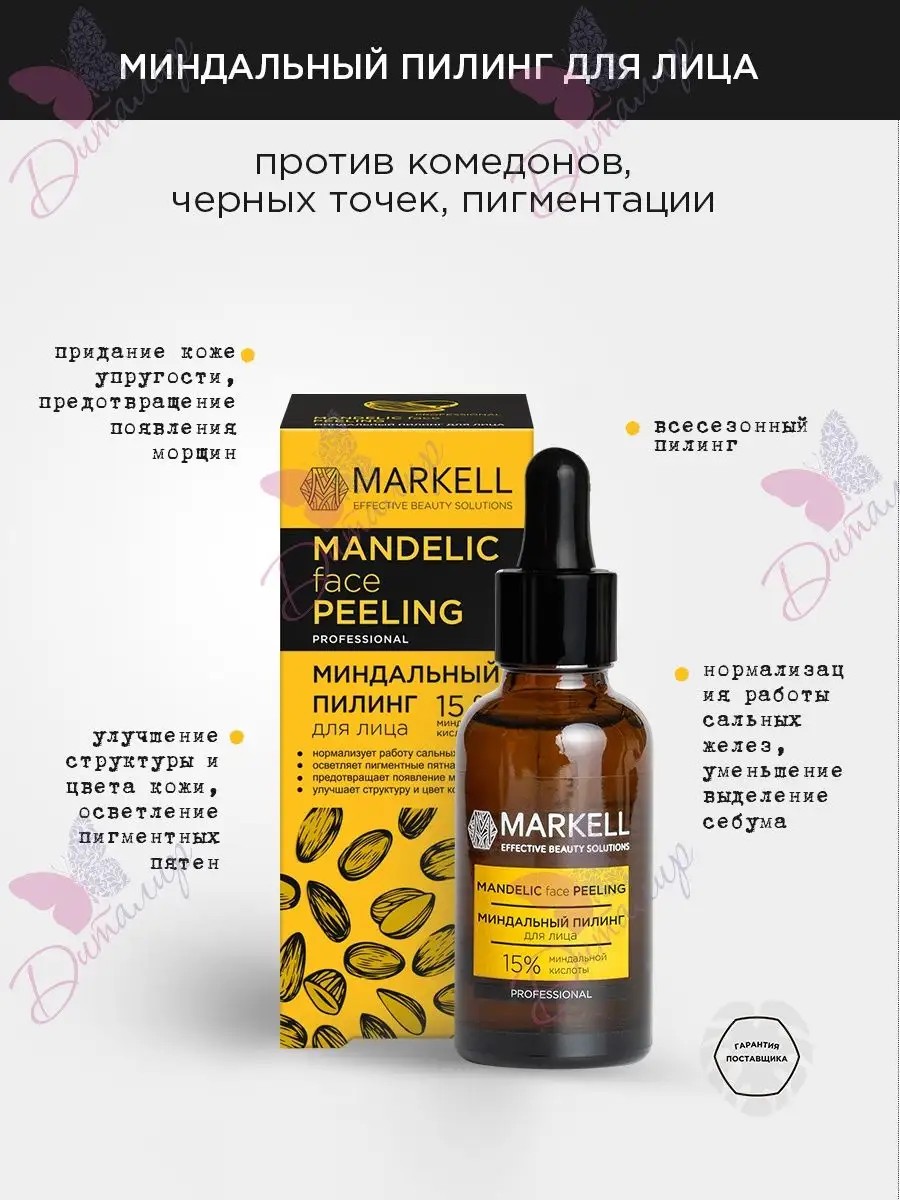Professional Acid Almond Facial Peel for comedones, blackheads, and pigmentation. Say goodbye to acne, post-acne, comedones, blackheads, pigmentation, and oily skin! Your new assistant in the fight against problem skin is this concentrated facial peel with almond acid from MARKELL. The main secret to smooth, healthy skin is inside this PROFESSIONAL series box—open it now! pH 1.6-1.8. This all-season peel can be used in summer with SPF 30+. Suitable for sensitive skin. Contraindications: herpes, severe rosacea, skin hypersensitivity, recent skin injuries, chronic dermatoses in the acute stage (eczema, demodicosis), individual intolerance to the product's components, immediately after prolonged sun exposure and/or visiting a solarium. MANDELIC ACID is one of the mildest acids for delicate exfoliation of the stratum corneum cells. Slowly penetrates the skin without causing irritation. Deeply cleanses pores, relieves inflammation, eliminates acne and post-acne, and has a sebum-regulating effect. Active ingredients: Mandelic acid, Allantoin.