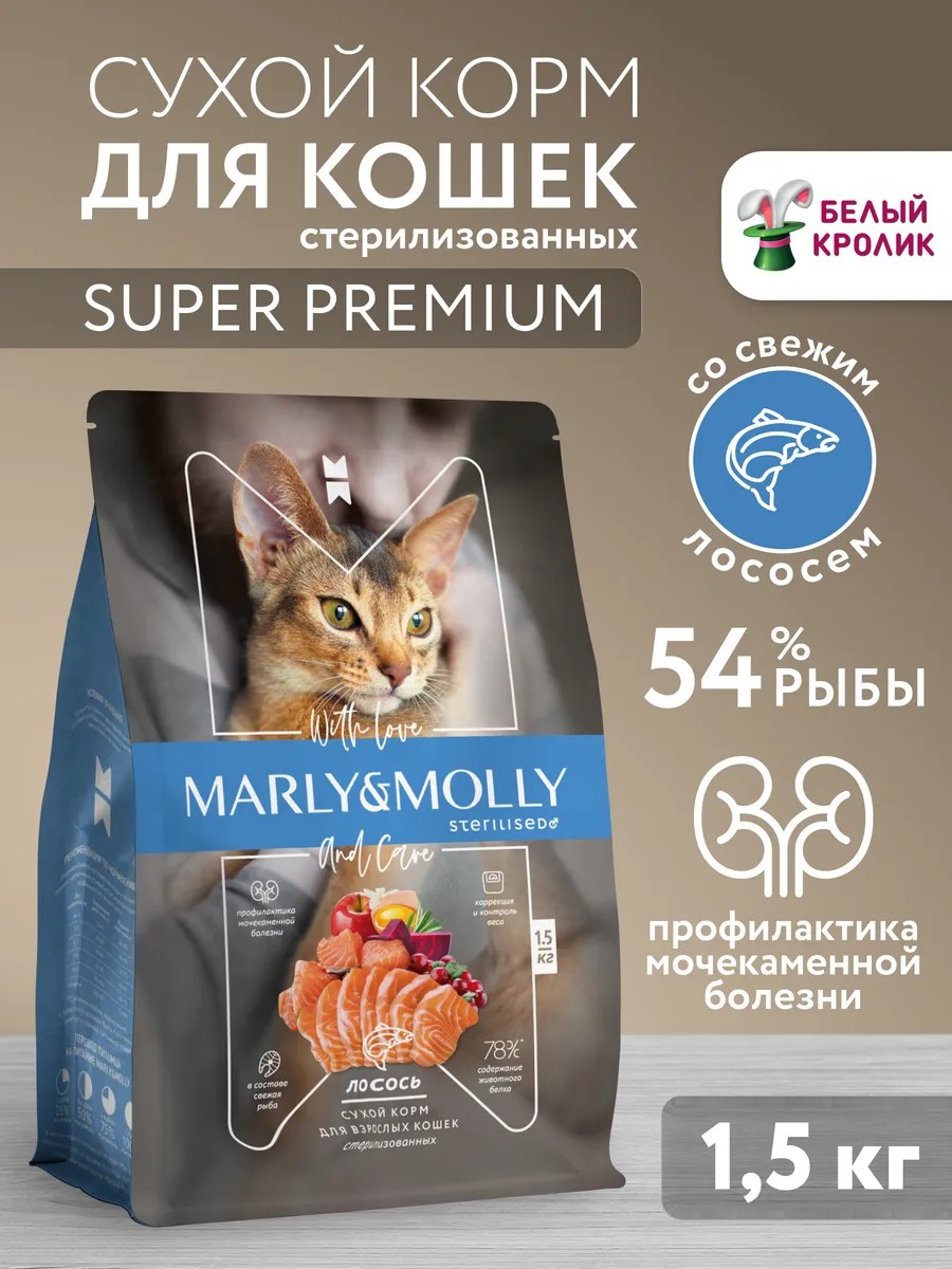 Стерилизованные кошки охотнее набирают вес, особенно уязвимы и нуждаются в специальном сбалансированном питании. Для профилактики мочекаменной болезни и контроля веса питомца в полнорационном корме Marly&Molly содержится меньше жира и больше клетчатки, что обеспечит кошке долгую здоровую жизнь.