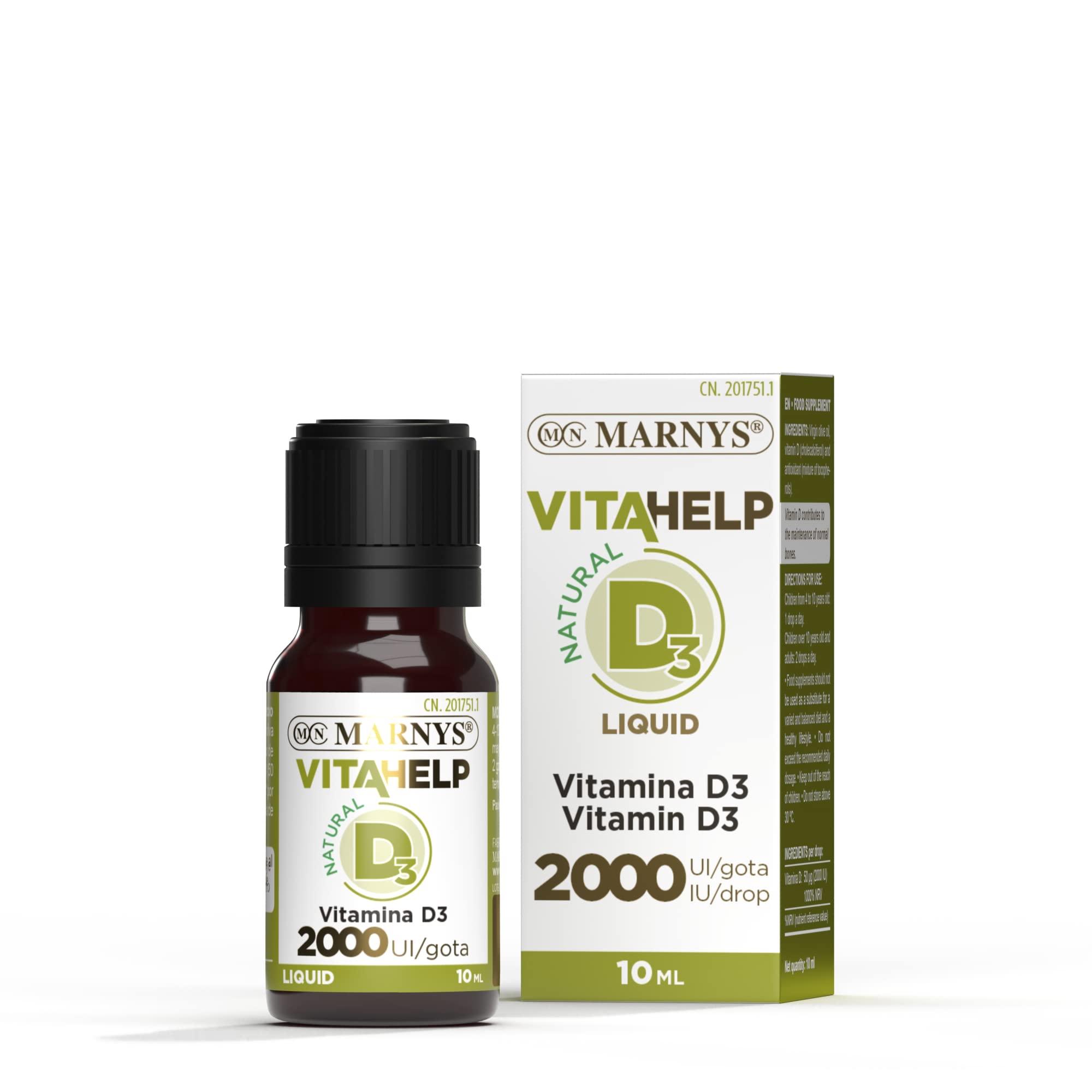 Vitamin D 2000 IU provides 50 µg (2000 IU) of vitamin D in a liquid form based on olive oil, which enhances the absorption and bioavailability of vitamin D. INGREDIENTS Virgin olive oil, vitamin D (cholecalciferol) (50 µg 2000 IU 1000 NRV per drop), and antioxidant (mixed tocopherols). DIRECTIONS Take once daily. Children 4-10 years: 1 drop 10 years and adults: 2 drops. See moreInstructions for correct use: Take once a day. Children 4-10 years: 1 drop 10 years and adults: 2 drops. Ingredients: Virgin olive oil, vitamin D (cholecalciferol) (50 µg 2000 IU 1000 NRV per drop) and antioxidant (mixed tocopherols). High quality: Made in Spain, compliant with Good Manufacturing Practices (GMP) and IFS Food version 6.1 certified. GMO-free, with no artificial preservatives or additives. Vitahelp Liquid Vitamin D contributes to the normal absorption and utilization of calcium and phosphorus and to the immune system, including in children. With virgin olive oil. Vitamin D contributes to the maintenance of normal bones, teeth, and muscle function. In addition, vitamin D, along with calcium, is necessary for normal growth and bone development in children. It supports the immune system. Vitamin D is known as the sunshine vitamin, but its synthesis in the skin through sunlight is insufficient to meet the needs of European countries. This is a high-concentration liquid vitamin D3, with 2000 IU (50 µg) per drop. Its liquid format with a dropper makes it very convenient for use by both children and adults.Marnys. Vitahelp - Vitamine D 2000 Ui liquide - Bouteille Ml - Gouttes - Maintient les articulations et les os sains et améliore le système immunitaire - Made In Europe Ml, 10 mlDESCRIPTION DU PRODUIT DESCRIPTION DU PRODUIT Vitamine D 2000 UI apporte une teneur de 50 µg (2000 UI), sous forme liquide à base d'huile d'olive, qui améliore l'absorption et la disponibilité de la vitamine D. INGRÉDIENTS Huile d'olive vierge, vitamine D (cholécalciférol) (50 µg 2000 UI 1000 VRN par goutte) et antioxydant (mélange de tocophérols). MODE D'EMPLOI Prendre 1 fois par jour. Enfants 4-10 ans : 1 goutte 10 ans et adultes : 2 gouttes. Voir plusInstructions pour une utilisation correcte : prendre 1 fois par jour. Enfants 4-10 ans : 1 goutte 10 ans et adultes : 2 gouttes. Ingrédients : Huile d'olive vierge, vitamine D (cholécalciférol) (50 µg 2000 UI 1000 VRN par goutte) et antioxydant (mélange de tocophérols). Haute qualité : fabriqué en Espagne, conforme aux bonnes pratiques de fabrication (gmp) et certification ifs food version 6.1. Sans OGM, ni conservateurs ni additifs artificiels. E Vitahelp Vitamine D liquide contribue à l'absorption normale, l'utilisation du calcium et du phosphore et au système immunitaire, y compris les enfants. Avec de l'huile d'olive vierge. Les os et les muscles contribuent au maintien des os, des dents et de la fonction musculaire. En outre, la vitamine D, associée au calcium, est nécessaire à la croissance normale et au développement osseux chez les enfants. Elle favorise le système immunitaire. La vitamine D est connue sous le nom de vitamine du soleil, mais sa synthèse dans la peau par la lumière du soleil est insuffisante pour répondre aux besoins des pays européens. E vitamine D3 liquide haute concentration, avec 2000 ui (50µg) par goutte. Grand confort pour la prise de vue, aussi bien chez les enfants que les adultes grâce à son format liquide avec pipette.