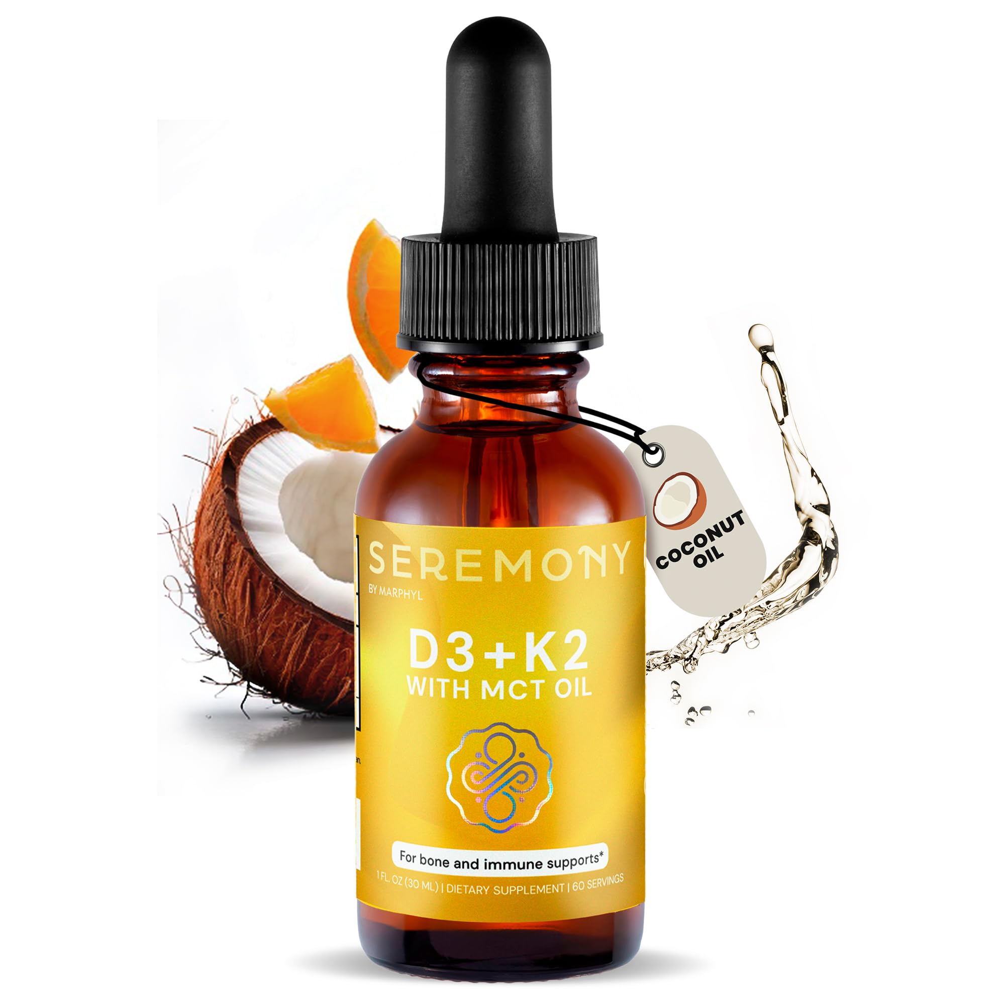 ALLERGEN FREE NO ARTIFICIAL INGREDIENTS: Our organic liquid vitamin drops are 100 vegan, cruelty free, non-GMO, gluten free, dairy free, soy free, and contain no artificial dyes, flavors, fillers, or added sugars. Great for individuals with food sensitivities, allergies, or dietary restrictions. Lab certified and made in the USA!. HOW TO USE: A simple and convenient way to protect against deficiencies and supplement missing D3 K2 from your diet. Simply shake the bottle well, take the recommended dose using the included dropper, then refrigerate after. The Orange flavored drops can be taken alone or mixed with your favorite beverage. Suitable for all ages and lifestyles, especially great for vegan and plant-based diets. FAST ABSORBING FOR NOTICEABLE RESULTS IN 2 WEEKS: Liquid vitamins have a higher absorption rate of 96 compared to traditional capsules, powder, or gummy vitamins with a rate of only 20 . Our easy-to-use, bioavailable Vitamin D3 K2 Drops are cold processed and pre-acidified so your body can easily absorb the essential vitamins and nutrients without being hard on your stomach!. PURE VITAMIN D3 K2 WITHOUT THE ADDED JUNK: With 100 mcg of D3 300 mcg of K2 per serving, you can feel confident that this is one of the most powerful Vitamin D K2 supplements you can find. Our D3 K2 liquid drops are free from fillers, preservatives added sugars, and artificial ingredients. Flavored with just a hint of organic MCT oil and organic orange oil, this immune support supplement provides purity and effectiveness. BOOST MOOD, IMMUNITY, BONE HEALTH, SKIN HEALTH MORE: SEREMONY Vegan Vitamin D3 K2 (MK7) Drops with 4000 IU are USA made with pure, plant based D3 K2 from naturally occurring plant species Lichen, Organic MCT oil, and Organic Orange oil. These high potency drops are essential for maintaining healthy bones and teeth, healthy skin, boosting immune system function, and improving overall wellness.