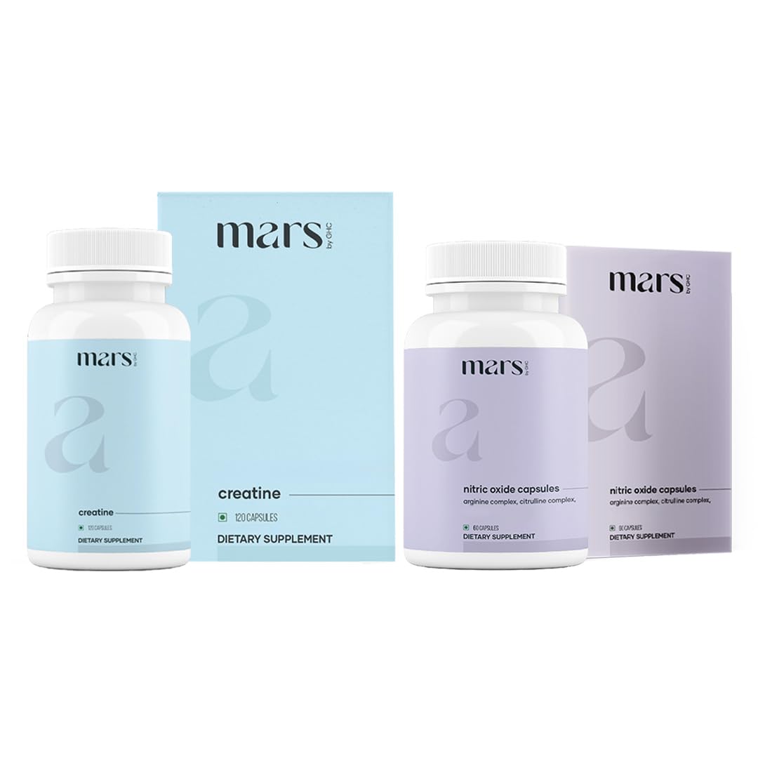 BEST USE - pre-workout supplement combo, daily fitness supplement pairing, energy and performance support in capsule form, plant-based wellness addition, travel-ready capsule duo, part of a structured wellness regime, used with other Mars fitness products. IDEAL FOR - daily fitness routine, gym-goers, active lifestyle support, wellness stack for performance-focused individuals, workout prep and recovery routine, general energy and stamina balance, capsule-based supplement plan, traditional herbal and mineral blends. PACK OF 1 COMBO SET – Includes both Nitric Oxide and Creatine bottles in one complete package. EASY TO CONSUME CAPSULES – Delivered in capsule form for convenience and ease of daily use. FORMULATED WITH KEY INGREDIENTS – Includes L-Arginine, Beetroot Extract, and plant-based Creatine, blended for comprehensive support. WORKOUT-FRIENDLY FORMAT – A convenient addition to your daily supplement plan, suitable for active individuals with structured workout goals. DUAL-SUPPORT COMBO PACK – Includes two supplement formulas: Nitric Oxide capsules and Creatine capsules, designed to work together in your daily routine.