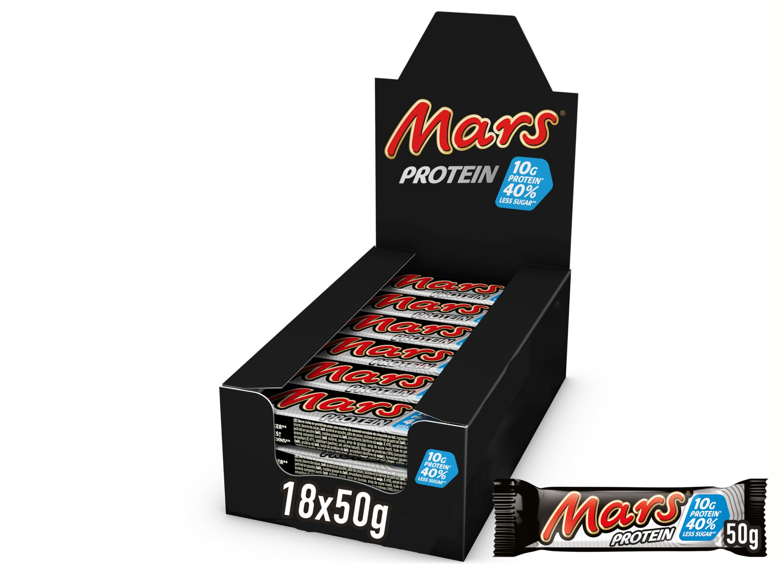 Mars Protein Single 18 x 50 grams INGREDIENTS Milk chocolate (24 ) (sugar, cocoa butter, skimmed milk powder). cocoa butter, cocoa mass, lactose and proteins from whey [milk] (from milk), whey [milk] powder (from milk), emulsifiers (soy lecithin - E476), palm fat, natural vanilla extract, caramel 21 , (sweetened condensed milk), glucose syrup, invert sugar syrup, palm oil, stabilizer (pectin), protein mixture (18 ) (whey [milk] protein concentrate (milk) (milk protein isolate), dried glucose syrup, low-fat cocoa, barley malt extract, sugar, glucose syrup, salt, egg white powder, milk protein, natural vanilla extract, milk chocolate contains at least 14 milk solids, milk chocolate contains vegetable fats in addition to cocoa butter INSTRUCTIONS FOR USE Consume as it is. Enjoy on the go or with friends and family. See moreMars Protein Single 18 x 50 gram Mars Protein Single 18 x 50 gram INGREDIËNTEN Melkchocolade (24 ) (suiker, cacaoboter, magere melkpoeder). cacaoboter, cacaomassa, lactose en eiwitten uit wei [melk] (uit melk), wei [melk] poeder (van melk), emulgatoren (sojalecithine - E476) palmvet, natuurlijk vanille-extract, karamel 21 , (gezoete gecondenseerde melk), glucosestroop, invertsuikersiroop, palmolie, stabilisator (pectine), eiwitmengsel (18 ) (wei [melk] eiwit concentraat (melk) (melkeiwitisolaat), gedroogde glucosestroop, vetarme cacao, gerstemout extract, suiker, glucosestroop, zout, eiwit poeder, melkeiwit, natuurlijk vanille-extract, melkchocolade bevat minimaal 14 melkbestanddelen, melkchocolade bevat plantaardige vetten naast cacaoboter GEBRUIKSAANWIJZING Consumeer zoals het is. Geniet onderweg of met vrienden en familie. Meer bekijken