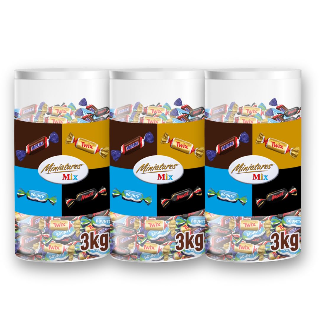 : Everyone will easily find something to love in this varied and colorful assortment of MARS, SNICKERS, BOUNTY, and TWIX chocolate bars. Four bars combined to form an appealing mix in a mini format. Whether for a birthday, as a Christmas gift, to enhance your Halloween candy, to follow the football season, or simply for a movie night, the Mars chocolate selection is perfect for treating yourself, your friends, or your family. 3 kg box of miniature milk chocolate bars (296 bars). Ingredients: ChocolateContents: 3x MINIATURE MIX Assortment of 296 Miniatures, Large Box, 3 kg. Get creative: Use this large format to fill a piñata, decorate cupcakes, create those gourmet baskets, or hide them with your Easter eggs. Ideal for sharing: Individual chocolate bars in miniature format, perfect for sharing at a party with family or friends. Ideal for gifting: Delight your family, friends, neighbors, or colleagues with a varied chocolate gift mix. There's something for everyone! Assortment of 3 x 3 kg of delicious chocolate bars in mini sizes: Mars, Snickers, Twix, and Bounty.Description du produit Chacun trouvera facilement son bonheur dans cet assortiment de chocolat varié et coloré des barres chocolatées MARS, SNICKERS, BOUNTY et TWIX. 4 barres réunies pour former un mélange séduisant au format mini. Que ce soit pour un anniversaire, en chocolat à offrir à Noël, pour agrémenter vos bonbons d'halloween, pour suivre la saison de football ou tout simplement pour une soirée cinéma, la sélection de chocolats Mars est parfaite pour se faire plaisir, faire plaisir à ses amis ou à sa famille. Boîte de 3 kg de barres de chocolat au lait miniatures (296 barres). Ingrédients ChocolatContenu : 3x MINIATURES MIX Assortiment de 296 Miniatures, Boîte Grand Format, 3 kg. Soyez créatif : Profitez de ce grand format pour remplir un pinata, garnir des cupcakes, créer ces paniers gourmands ou les cacher avec vos œufs de Pâques. Idéal à partager : barres de chocolat individuelles en format miniature, idéal pour partager lors d'une fête en famille ou entre amis. Idéal à offrir : Faites plaisir à votre famille, vos amis, vos voisins ou vos collègues de bureau avec un mélange de chocolat à offrir varié. Il y en a pour tous les goûts !. Assortiment de 3x3 kg de délicieuses barres chocolatées au format mini Mars, Snickers, Twix et Bounty.MARS, TWIX, SNICKERS, BOUNTY - Assortiment de Mini Barres Chocolatées MINIATURES MIX - Format Maxi 9kg - Chocolats en Vrac à Partager - Lot de 3x3kg