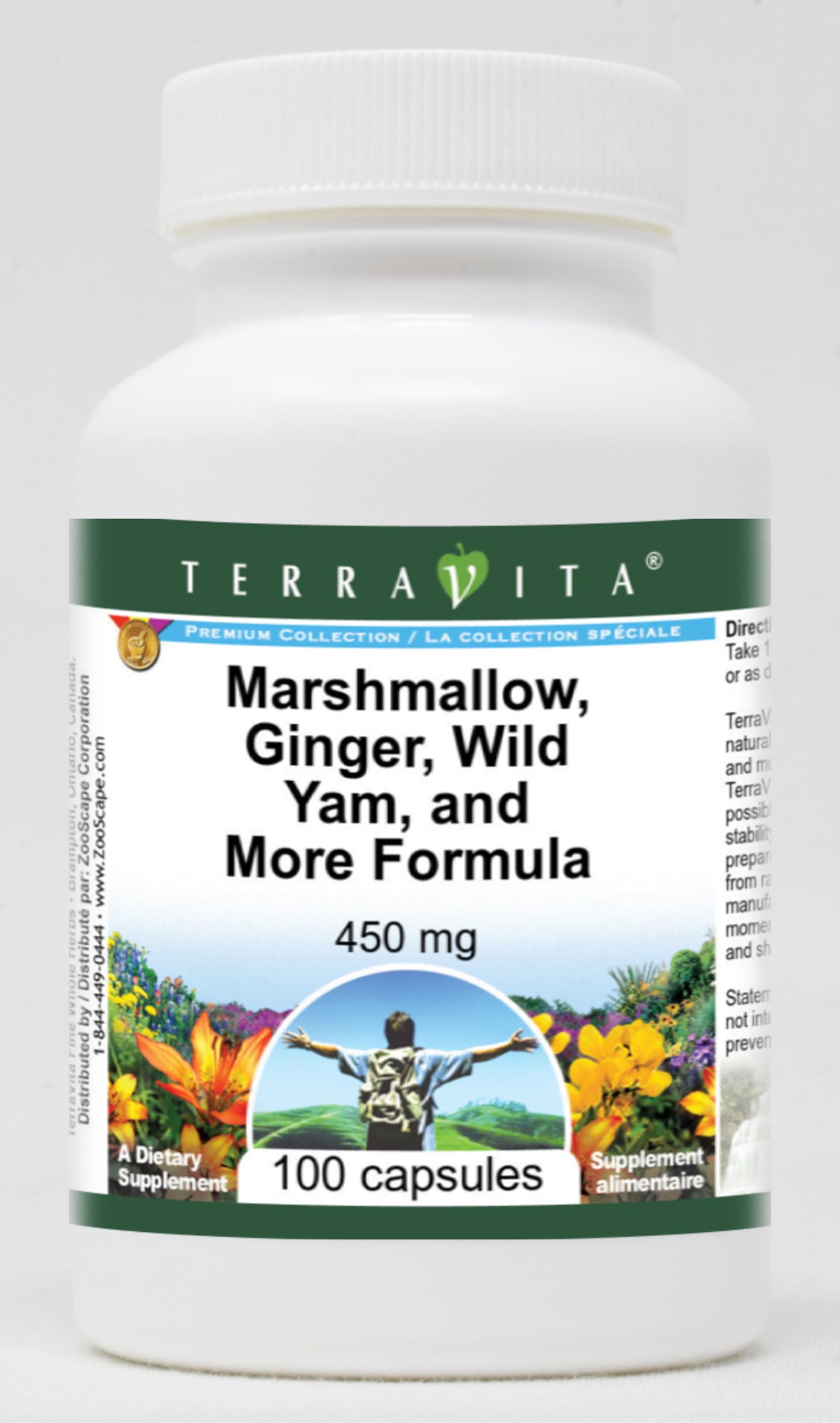 Marshmallow, Ginger, Wild Yam, and More Formula - 450 mg (100 capsules, ZIN: 512498) Packaged in the United States in a GMP certified facility (Good Manufacturing Practice). No fillers. Manufacturer: TerraVita Size: 100 capsules Easy-to-swallow Capsules in a sealed bottle. Ingredients: Gelatin, Water, Dong Quai Root - 75 mg, Ginger Root - 100 mg, Marshmallow Root - 100 mg, Slippery Elm Bark - 75 mg, Wild Yam Root - 100 mg