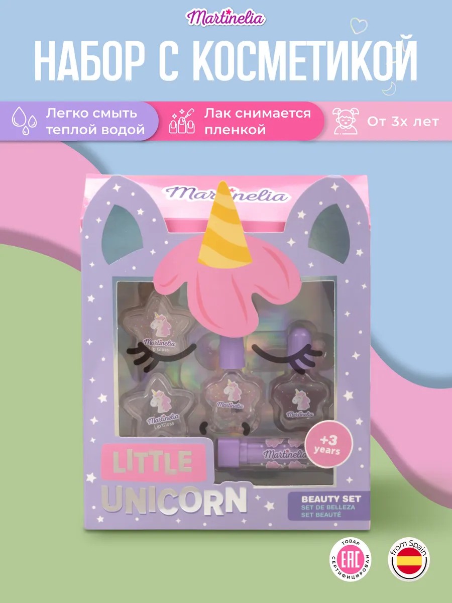 For little girls who are just starting to get into makeup, Martinelia has created a "Unicorn" makeup set. This children's makeup set includes 2 lip balms, 2 lipsticks, and 2 nail polishes. The lip balm, housed in a stylish star-shaped case, has a soft texture and gently moisturizes lips, protecting from wind, frost, and dry air. Lips acquire a subtle shine. The balm can be applied with fingers. The lipstick has the same properties as lip balm: it nourishes and protects against chapping. The convenient, classic lipstick shape makes it easy for little ones to apply makeup themselves. This children's makeup is completely water-washable. The nail polish dries in minutes and forms a film on the nails. This film can be easily removed when little ones want to change their nail design. Martinelia children's decorative cosmetics are hypoallergenic and suitable for daily use. This makeup and manicure gift set will delight your daughter and friend.
