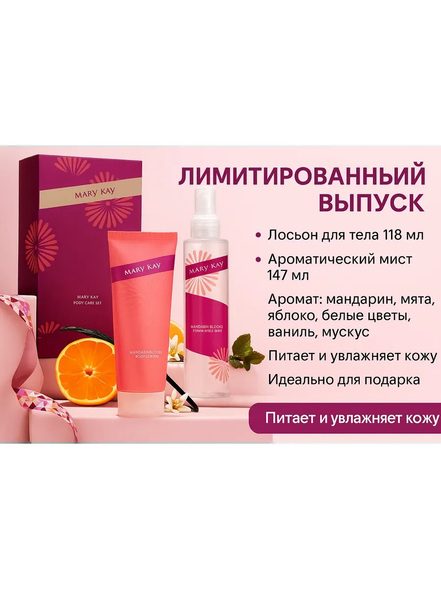 Лимитированный набор Mary Kay “Mandarin Blooms” — это нежный лосьон для тела и ароматический мист с утонченным фруктово-цветочным ароматом. Верхние ноты раскрываются свежестью мандарина, мяты и сочного яблока, в сердце — пион, белые цветы и кумарин, а в базе — теплое кокосовое молоко, ваниль и мускус. Лосьон питает и увлажняет кожу, оставляя ее гладкой и шелковистой, а мист окутывает легким, стойким шлейфом. Идеальный подарок для себя или близких.