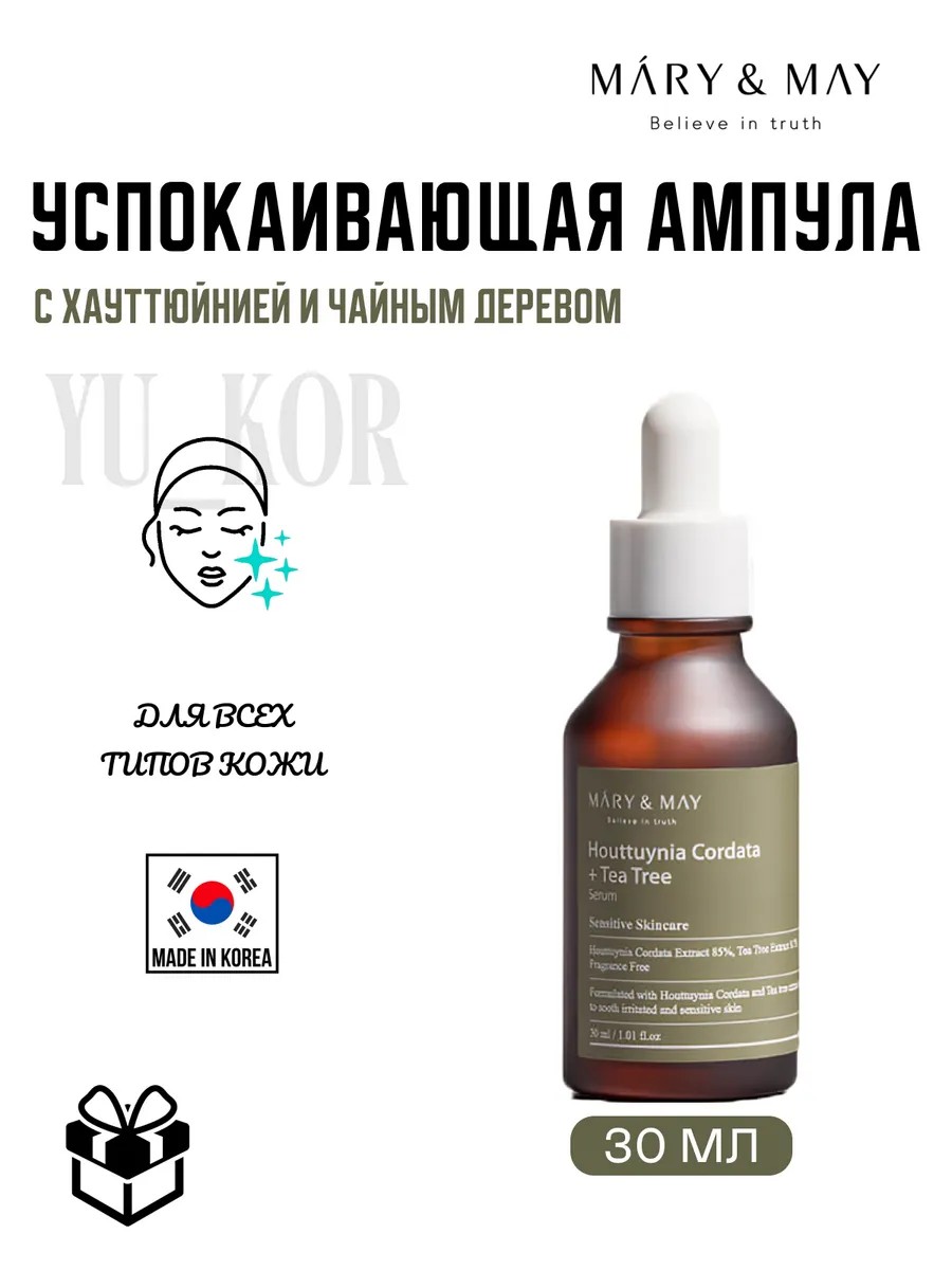 Успокаивающая ампула с хауттюйнией и чайным деревом Mary&May Houttuynia Cordata + Tea Tree Serum ускоряет заживление воспалений, препятствует развитию акне и угревой сыпи. Оказывает противомикробное действие, укрепляет защитный барьер и уменьшает жирность кожи.