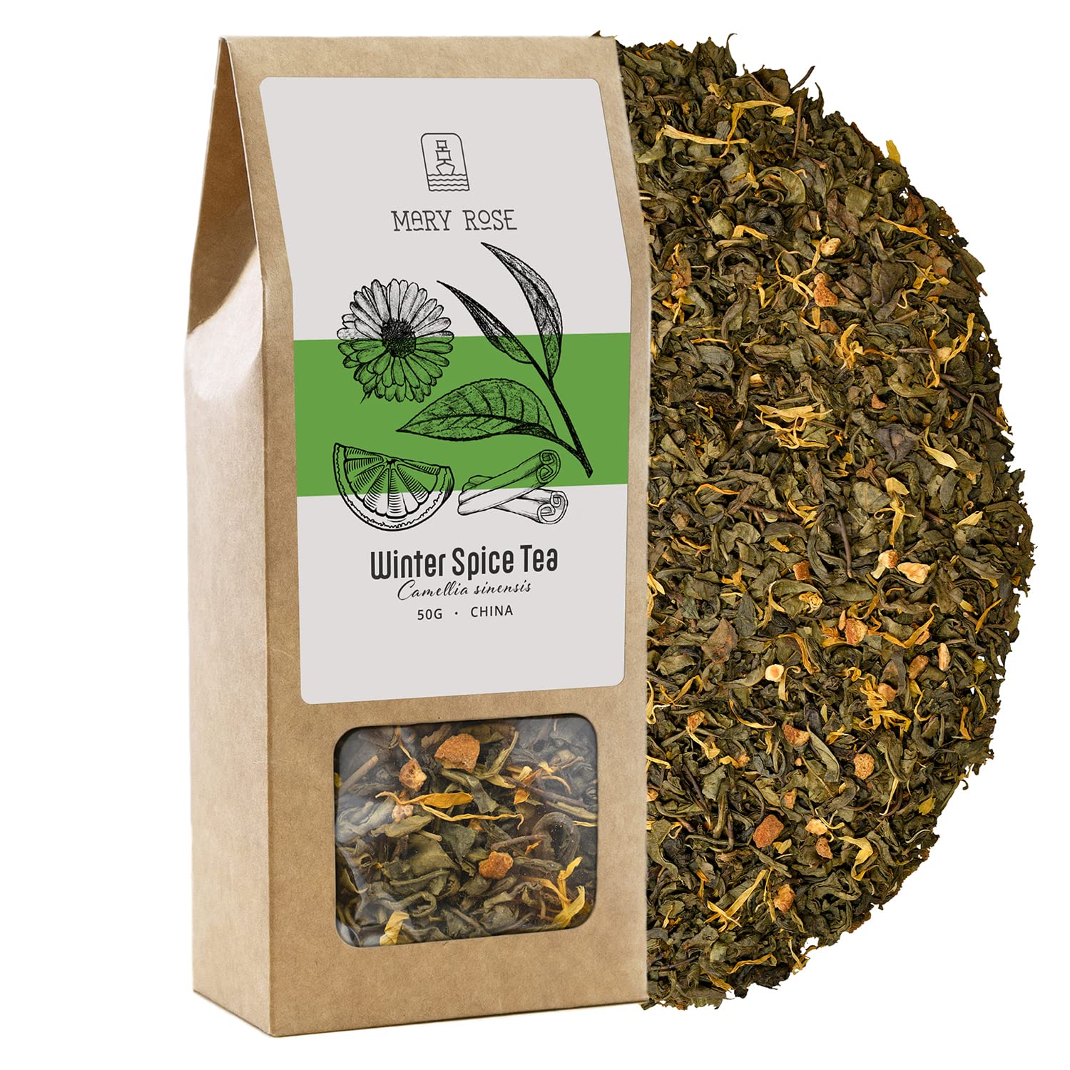 Mary Rose Winter Spice Th vert | Th vert chinois Yunnan | Th chauffant la cannelle | Additifs naturels | Source de th ine | Stimulation naturelle | 50 g
