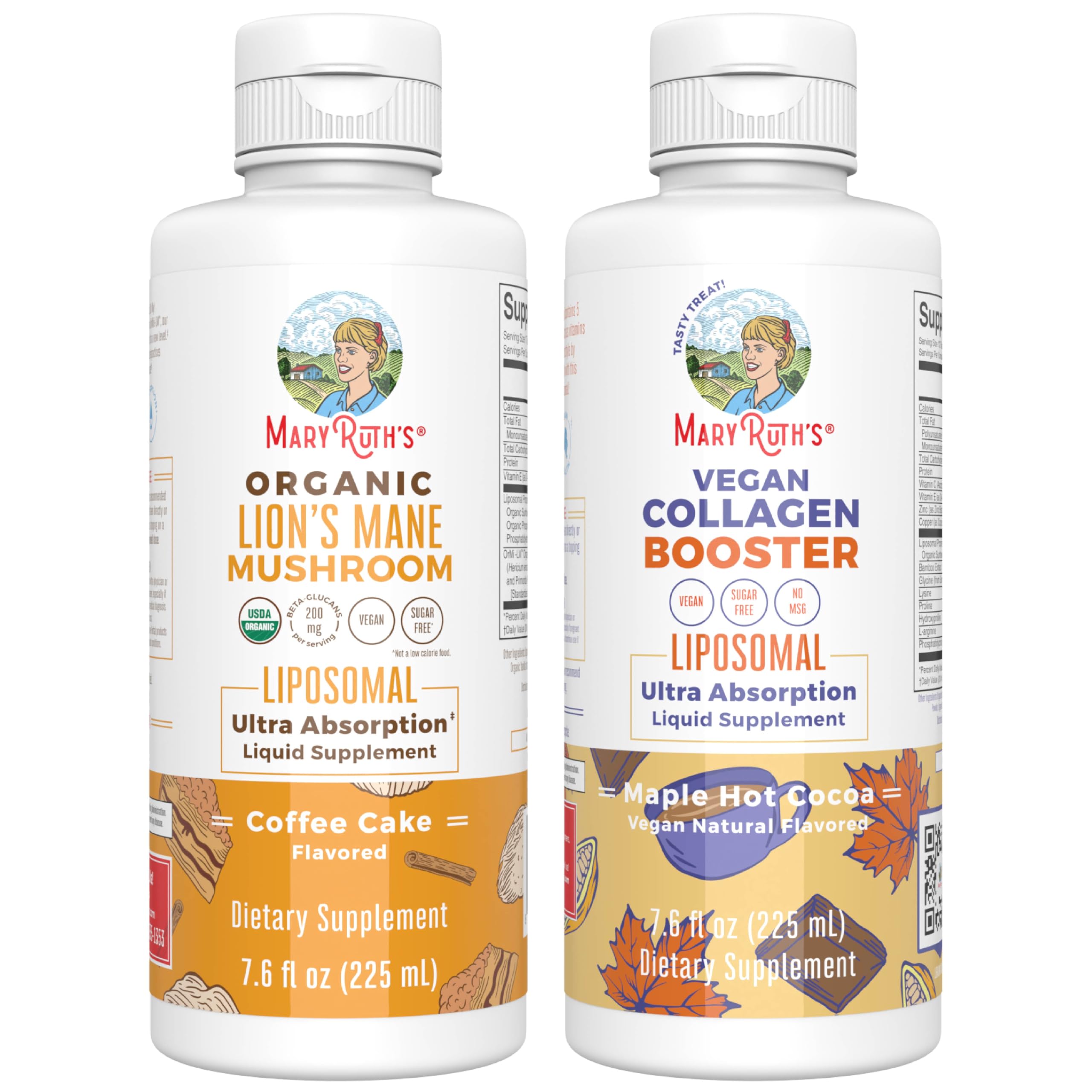 A Formula You Can Trust: MaryRuth's Lion's Mane Liposomal (Coffee Cake) Collagen Booster Liposomal (Maple Hot Cocoa) are B Corp Certified Clean Label Project Verified Lion's Mane: These zero-waste mushrooms benefit you and the planet! Our Lion's Mane Liposomal supports cognitive health with enhanced benefits. Collagen Booster Liposomal: Boost collagen with 5 amino acids, vitamins C E, zinc, copper, and silica. Enjoy the delicious Maple Hot Cocoa flavor for skin and joint support! Organic Mushroom Supplement: These mushrooms are grown with zero waste practices making them good for you and the planet! Featuring the cognitive benefits of full-spectrum OrMiu-LM, our delectable Lion's Mane Liposomal takes this herb to a new level. Collagen Boosting Liposomal: A delicious liposomal to support your body's ability to make collagen! Our Vegan Collagen Booster Liposomal contains 5 amino acids as well as nutrients such as vitamins C E, zinc, copper, and silica! Support your skin and joint health with this delicious Maple Hot Cocoa liposomal. Multiple Benefits: Lion's Mane Liposomal: Enjoy full-spectrum Organic Lion's Mane, including primordia, mycelium, and fruiting bodies, delivering 1g (200mg Beta-Glucans) per serving. Collagen Liposomal: Our vegan liposomal helps your body produce collagen, supporting bones, skin, and connective tissue, with vitamin C aiding collagen production. For Most Lifestyles: Both products are Non-GMO, Vegan, Dairy Free, Gluten Free, Sugar Free, Soy Free, Made in a GMP Facility, contains NUTS: Almonds. Clean Label Project Verified, B Corp Certified. No Artificial Colors or MSG, NOT a Low-calorie food. Reishi Mushroom: USDA Organic Important: Our bundles may contain overlapping nutrients. Consult your physician to determine the right supplements and dosages for your health.For Most Lifestyles: Both products are Non-GMO, Vegan, Dairy Free, Gluten Free, Sugar Free, Soy Free, Made in a GMP Facility, contains NUTS: Almonds. Clean Label Project Verified, B Corp Certified. No Artificial Colors or MSG, NOT a Low-calorie food. Reishi Mushroom: USDA Organic Important: Our bundles may contain overlapping nutrients. Consult your physician to determine the right supplements and dosages for your health. Multiple Benefits: Lion's Mane Liposomal: Enjoy full-spectrum Organic Lion's Mane, including primordia, mycelium, and fruiting bodies, delivering 1g (200mg Beta-Glucans) per serving. Collagen Liposomal: Our vegan liposomal helps your body produce collagen, supporting bones, skin, and connective tissue, with vitamin C aiding collagen production. Collagen Boosting Liposomal: A delicious liposomal to support your body's ability to make collagen! Our Vegan Collagen Booster Liposomal contains 5 amino acids as well as nutrients such as vitamins C E, zinc, copper, and silica! Support your skin and joint health with this delicious Maple Hot Cocoa liposomal. Organic Mushroom Supplement: These mushrooms are grown with zero waste practices making them good for you and the planet! Featuring the cognitive benefits of full-spectrum OrMiu-LM, our delectable Lion's Mane Liposomal takes this herb to a new level. A Formula You Can Trust: MaryRuth's Lion's Mane Liposomal (Coffee Cake) Collagen Booster Liposomal (Maple Hot Cocoa) are B Corp Certified Clean Label Project Verified Lion's Mane: These zero-waste mushrooms benefit you and the planet! Our Lion's Mane Liposomal supports cognitive health with enhanced benefits. Collagen Booster Liposomal: Boost collagen with 5 amino acids, vitamins C E, zinc, copper, and silica. Enjoy the delicious Maple Hot Cocoa flavor for skin and joint support!.
