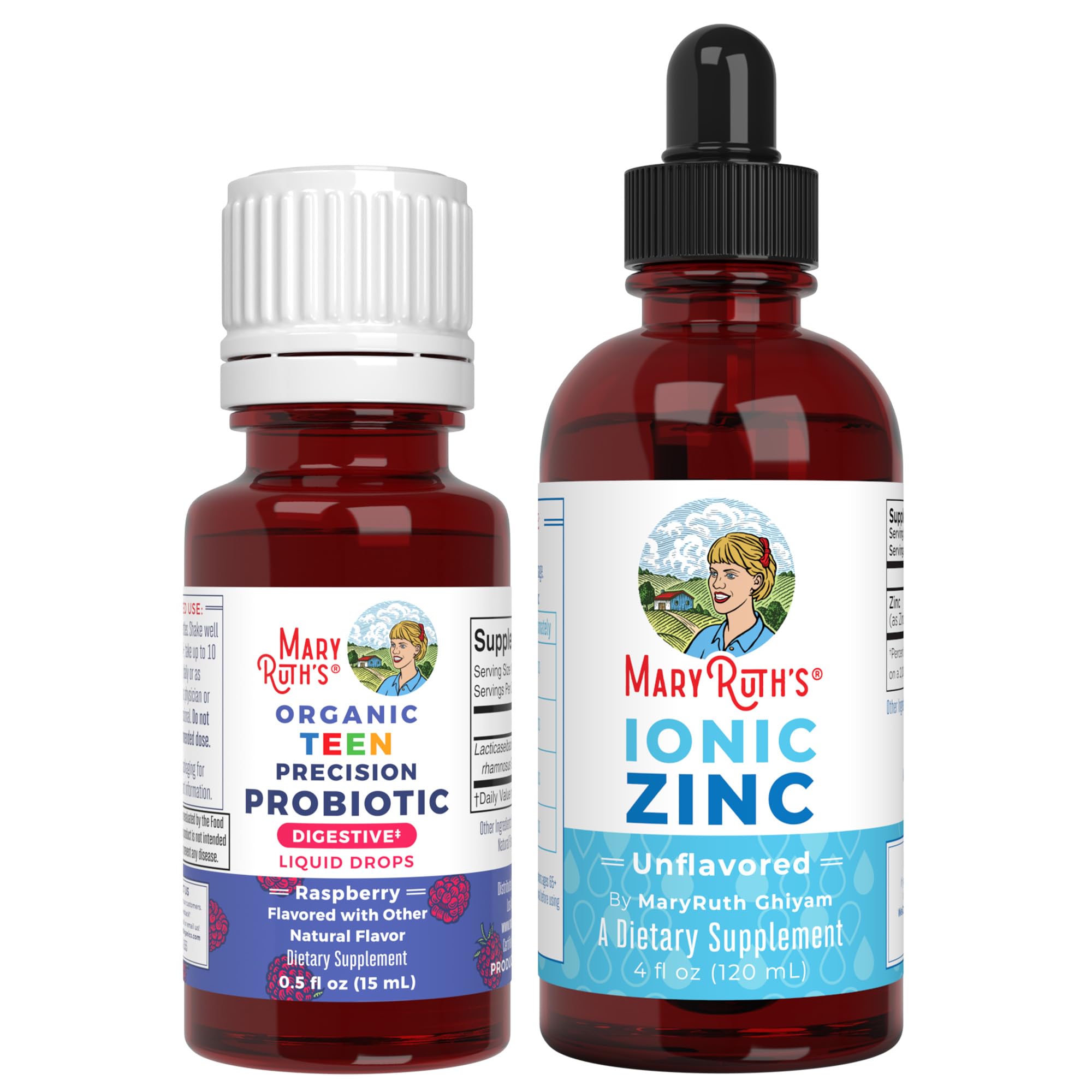A Formula You Can Trust: MaryRuth's Precision Probiotic Drops for Teens (Raspberry) Zinc Drops are B Corp Certified and Clean Label Project Verified Teen's Probiotic Drops: For gut health and occasional digestive discomfort, try these easy-to-take, delicious, and raspberry-flavored probiotic drops with LGG! Zinc Drops (Unflavored): Support your skin and health with our easy-to-take drops, essential for optimal zinc levels and a healthy immune system. Liquid Teen's Probiotic Drops: For teens looking to support occasional digestive discomfort and optimal gut health, these probiotic drops are a great choice. Our easy-to-take, raspberry-flavored liquid drops are formulated with the clinically studied probiotic strain Lacticaseibacillus rhamnosus LGG. Vegan Zinc Supplements for Men, Women, and Kids: Provide immune support and skin care with our easy-to-take Liquid Zinc mineral drops. The optimal concentration of zinc in the body is necessary for healthy immune function, and homeostasis of this mineral plays a role in supporting the health of your body's macrophages. Multiple Benefits: Teen Probiotic for Digestive Health: This strain supports digestive health, normal GI function, and may help with occasional gut discomfort. Zinc Drops: Zinc supports immune function, metabolism, skin health, and cognitive development, playing a key role in various essential bodily processes. For Most Lifestyles: Both products are Vegan, Non-GMO, Dairy Free, Nut Free, Gluten Free, Soy Free, Dairy Free, Sugar Free, Made in a GMP Facility, Alcohol-Free Tincture Clean Label Project Verified. B Corp Certified. Important: Our bundles combine complementary purchases and special interests. Some nutrients may appear in multiple products and could exceed your needs. Consult your physician to determine the right supplements and dosages for your health.For Most Lifestyles: Both products are Vegan, Non-GMO, Dairy Free, Nut Free, Gluten Free, Soy Free, Dairy Free, Sugar Free, Made in a GMP Facility, Alcohol-Free Tincture Clean Label Project Verified. B Corp Certified. Important: Our bundles combine complementary purchases and special interests. Some nutrients may appear in multiple products and could exceed your needs. Consult your physician to determine the right supplements and dosages for your health. Multiple Benefits: Teen Probiotic for Digestive Health: This strain supports digestive health, normal GI function, and may help with occasional gut discomfort. Zinc Drops: Zinc supports immune function, metabolism, skin health, and cognitive development, playing a key role in various essential bodily processes. Vegan Zinc Supplements for Men, Women, and Kids: Provide immune support and skin care with our easy-to-take Liquid Zinc mineral drops. The optimal concentration of zinc in the body is necessary for healthy immune function, and homeostasis of this mineral plays a role in supporting the health of your body's macrophages. Liquid Teen's Probiotic Drops: For teens looking to support occasional digestive discomfort and optimal gut health, these probiotic drops are a great choice. Our easy-to-take, raspberry-flavored liquid drops are formulated with the clinically studied probiotic strain Lacticaseibacillus rhamnosus LGG. A Formula You Can Trust: MaryRuth's Precision Probiotic Drops for Teens (Raspberry) Zinc Drops are B Corp Certified and Clean Label Project Verified Teen's Probiotic Drops: For gut health and occasional digestive discomfort, try these easy-to-take, delicious, and raspberry-flavored probiotic drops with LGG! Zinc Drops (Unflavored): Support your skin and health with our easy-to-take drops, essential for optimal zinc levels and a healthy immune system.