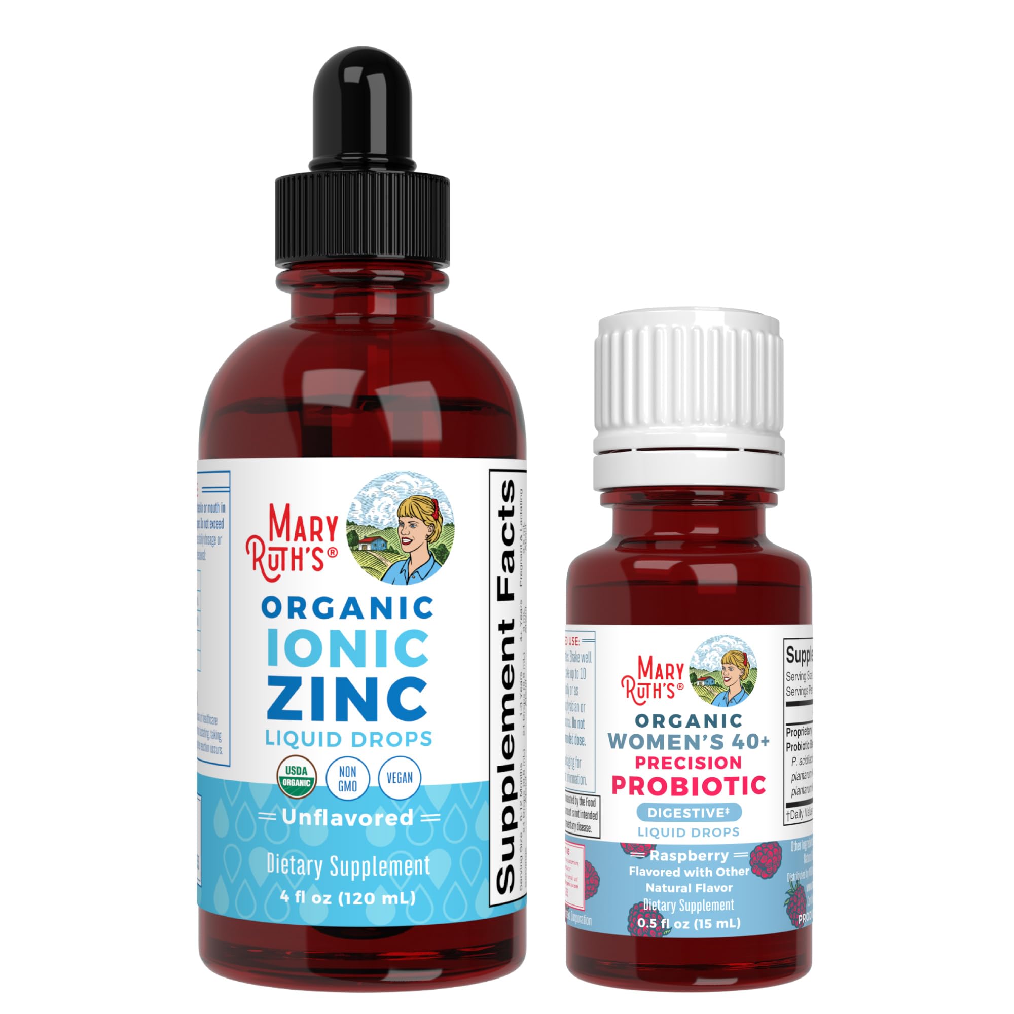 A Formula You Can Trust: MaryRuth's Precision Digestion Drops for Women 40 (Raspberry) Zinc Drops are B Corp Certified and Clean Label Project Verified Women's Probiotics: Formulated for women 40 , these probiotic drops help relieve stress-related GI issues and occasional digestive discomfort with 10 drops daily. Zinc Drops (Unflavored): Support your skin and health with our easy-to-take drops, essential for optimal zinc levels and a healthy immune system. Womens Probiotics for Digestive Health: We've formulated these targeted probiotic drops for the digestive health of women 40 and over. Help stress-related GI issues and relieve occasional digestive discomfort with just 10 drops per day! Zinc for Men, Women, and Kids: Provide immune support and skin care with our easy-to-take Liquid Zinc drops. The optimal concentration of zinc in the body is necessary for healthy immune function, and homeostasis of this mineral plays a role in supporting the health of your body's macrophages, an important component of your innate immune system. Multiple Benefits: Women's Probiotic Drops: Relieve occasional gut disturbances and support optimal digestion (even with dairy!), using these probiotic drops that also aid stress-related GI issues. Zinc Drops: Zinc is essential for health, supporting immune function, gene expression, DNA repair, and skin care. These drops provide a simple way to meet your body's zinc needs! For Most Lifestyles: Both products are Non-GMO, Vegan, Dairy Free, Nut Free, Gluten Free, Soy Free, Sugar Free, and made in a GMP Facility. Women's 40 Probiotic Digestive Drops: USDA Organic Liquid Ionic Zinc: Corn Free, Wheat Free, Nightshade Free, with 40 servings per bottle. Clean Label Project Verified. B Corp Certified. Important: Our bundles may contain overlapping nutrients. Consult your physician to determine the right supplements and dosages for your health.For Most Lifestyles: Both products are Non-GMO, Vegan, Dairy Free, Nut Free, Gluten Free, Soy Free, Sugar Free, and made in a GMP Facility. Women's 40 Probiotic Digestive Drops: USDA Organic Liquid Ionic Zinc: Corn Free, Wheat Free, Nightshade Free, with 40 servings per bottle. Clean Label Project Verified. B Corp Certified. Important: Our bundles may contain overlapping nutrients. Consult your physician to determine the right supplements and dosages for your health. Multiple Benefits: Women's Probiotic Drops: Relieve occasional gut disturbances and support optimal digestion (even with dairy!), using these probiotic drops that also aid stress-related GI issues. Zinc Drops: Zinc is essential for health, supporting immune function, gene expression, DNA repair, and skin care. These drops provide a simple way to meet your body's zinc needs!. Zinc for Men, Women, and Kids: Provide immune support and skin care with our easy-to-take Liquid Zinc drops. The optimal concentration of zinc in the body is necessary for healthy immune function, and homeostasis of this mineral plays a role in supporting the health of your body's macrophages, an important component of your innate immune system. Women's Probiotics for Digestive Health: We've formulated these targeted probiotic drops for the digestive health of women 40 and over. Help stress-related GI issues and relieve occasional digestive discomfort with just 10 drops per day!. A Formula You Can Trust: MaryRuth's Precision Digestion Drops for Women 40 (Raspberry) Zinc Drops are B Corp Certified and Clean Label Project Verified Women's Probiotics: Formulated for women 40 , these probiotic drops help relieve stress-related GI issues and occasional digestive discomfort with 10 drops daily. Zinc Drops (Unflavored): Support your skin and health with our easy-to-take drops, essential for optimal zinc levels and a healthy immune system.