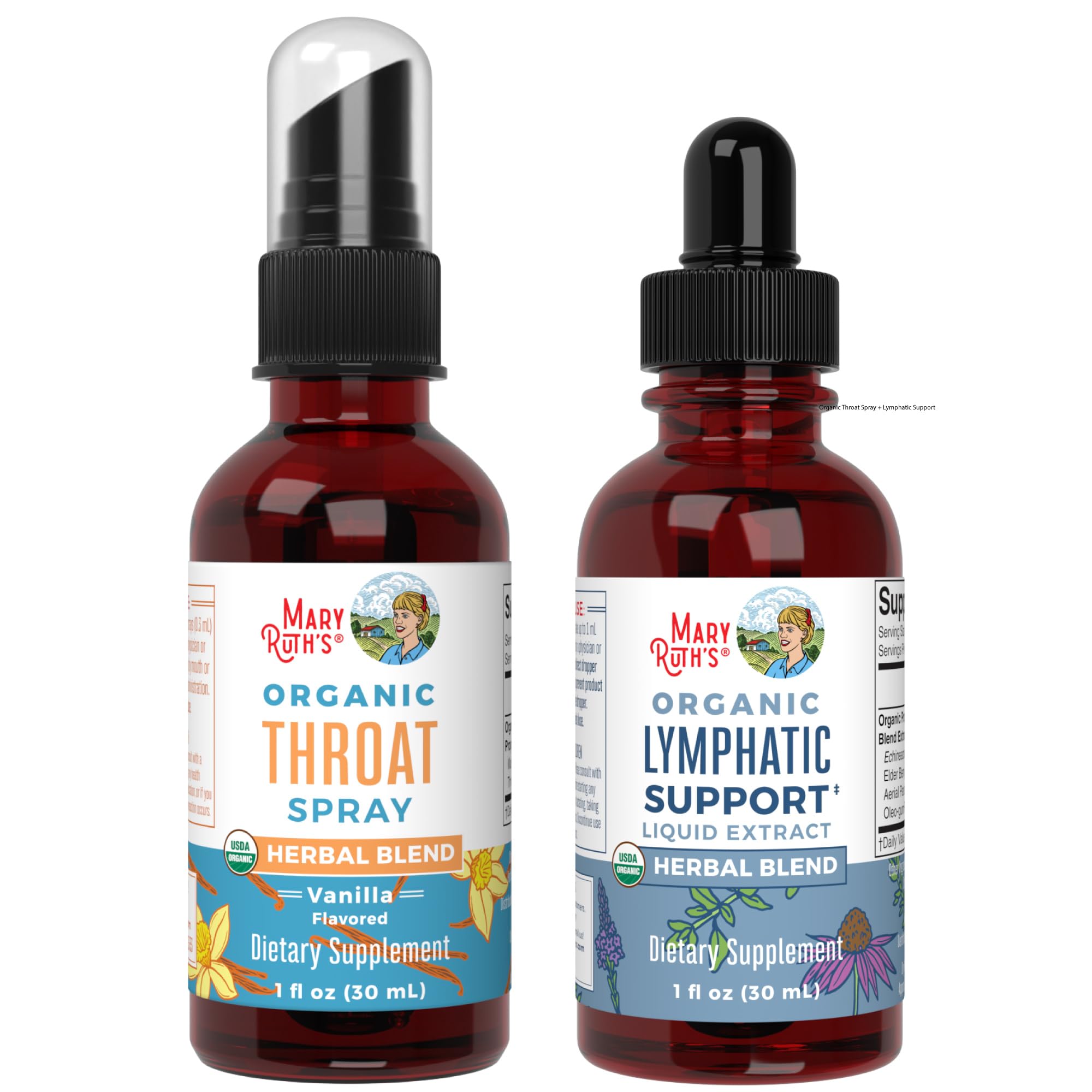 A Formula You Can Trust: MaryRuth's Organic Throat Spray (Vanilla) Lymphatic Cleanse Drops are USDA Organic and Clean Label Project Verified Organic Throat Spray: A blend of four traditional herbs for throat support, available in unflavored or delicious vanilla. Lymphatic Cleanse Drops: The lymphatic system, a network of vessels, tissues, and organs, supports immunity and maintains the body's fluid balance. Certified Organic Spray for Throat: A blend of four traditional herbals formulated for your throat! Enjoy this easy-to-take spray either unflavored or in a delicious vanilla flavor. Lymphatic System Support: The lymphatic system is a network of vessels, tissues, and organs that are integral to our health. It provides our bodies with immune support through its antigen and immune cell production and maintains fluid balance in the body. Multiple Benefits: Organic Throat Spray: Enjoy an organic blend of Marshmallow Root, Mullein Leaf, Thyme Leaf, and Licorice Root for throat support. Two sprays provide 355mg of this herbal extract! Lymphatic Drops: Support your lymphatic system's health with this herbal blend, featuring eight traditionally used herbs in easy-to-take liquid drops. For Most Lifestyles: Both products are USDA Organic, Non-GMO, Vegan, Dairy Free, Nut Free, Gluten Free, Sugar Free, No Synthetic or Artificial Colors, No Preservatives, Made in a GMP Facility Alcohol-Free Tincture Clean Label Project Verified, B Corp Certified Important: Our bundles may contain overlapping nutrients. Consult your physician to determine the right supplements and dosages for your health.For Most Lifestyles: Both products are USDA Organic, Non-GMO, Vegan, Dairy Free, Nut Free, Gluten Free, Sugar Free, No Synthetic or Artificial Colors, No Preservatives, Made in a GMP Facility Alcohol-Free Tincture Clean Label Project Verified, B Corp Certified Important: Our bundles may contain overlapping nutrients. Consult your physician to determine the right supplements and dosages for your health. Multiple Benefits: Organic Throat Spray: Enjoy an organic blend of Marshmallow Root, Mullein Leaf, Thyme Leaf, and Licorice Root for throat support. Two sprays provide 355mg of this herbal extract! Lymphatic Drops: Support your lymphatic system's health with this herbal blend, featuring eight traditionally used herbs in easy-to-take liquid drops. Lymphatic System Support: The lymphatic system is a network of vessels, tissues, and organs that are integral to our health. It provides our bodies with immune support through its antigen and immune cell production and maintains fluid balance in the body. Certified Organic Spray for Throat: A blend of four traditional herbals formulated for your throat! Enjoy this easy-to-take spray either unflavored or in a delicious vanilla flavor. A Formula You Can Trust: MaryRuth's Organic Throat Spray (Vanilla) Lymphatic Cleanse Drops are USDA Organic and Clean Label Project Verified Organic Throat Spray: A blend of four traditional herbs for throat support, available in unflavored or delicious vanilla. Lymphatic Cleanse Drops: The lymphatic system, a network of vessels, tissues, and organs, supports immunity and maintains the body's fluid balance.