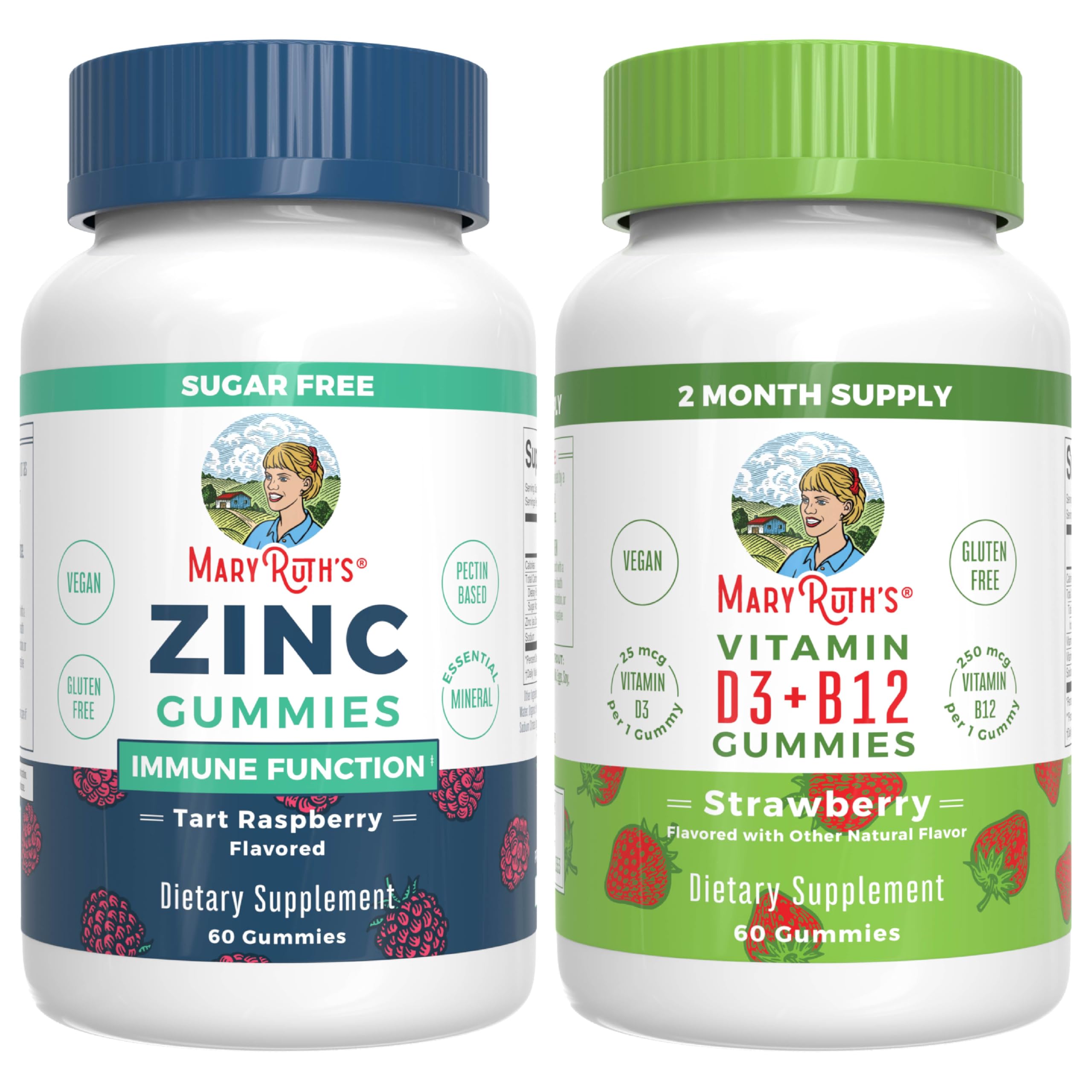 A Formula You Can Trust: MaryRuth's Zinc Gummies (Tart Raspberry) Vitamin D3 B12 Gummies (Strawberry) are B Corp Certified and Clean Label Project Verified Zinc Gummies: Optimal zinc levels are essential for immune health, supporting macrophages, a key component of your body's innate immune system. Vitamin D3 B12 Gummies: Boost energy levels and immune function with tasty strawberry or raspberry gummies, made with D3 (Cholecalciferol) and Methyl B12. Adult Zinc Gummies: Zinc is a trace mineral that is important for the integrity of the immune system. As one of the most abundant trace minerals in your body, zinc is present in all body tissues. Methyl B12 Vitamin D Gummies: Support your body's energy levels and immune function with a tasty strawberry or raspberry-flavored gummy. These gummies are made with Cholecalciferol (D3) and Methylcobalamin (a methylated form of B12). Multiple Benefits: Zinc Gummies: Optimal zinc levels are crucial for immune health, supporting macrophages, a key part of your body's innate immune system. Vitamin D3 B12 Gummies: D3 (cholecalciferol) supports calcium and phosphorus absorption, boosts immunity, promotes bone health, and aids in normal gene expression and cellular functions. For Most Lifestyles: Both products are Non-GMO, Vegan, Pectin Based, No Gelatin, Dairy Free, Gluten Free, Soy Free, Made in a GMP Facility Clean Label Project Verified, B Corp Certified Zinc Gummies: Nut Free Vitamin D3 B12 Gummies: Ogranic, Wheat Free, CONTAINS Coconut. Important: Our bundles may contain overlapping nutrients. Consult your physician to determine the right supplements and dosages for your health.For Most Lifestyles: Both products are Non-GMO, Vegan, Pectin Based, No Gelatin, Dairy Free, Gluten Free, Soy Free, Made in a GMP Facility Clean Label Project Verified, B Corp Certified Zinc Gummies: Nut Free Vitamin D3 B12 Gummies: Organic, Wheat Free, CONTAINS Coconut. Important: Our bundles may contain overlapping nutrients. Consult your physician to determine the right supplements and dosages for your health. Multiple Benefits: Zinc Gummies: Optimal zinc levels are crucial for immune health, supporting macrophages, a key part of your body's innate immune system. Vitamin D3 B12 Gummies: D3 (cholecalciferol) supports calcium and phosphorus absorption, boosts immunity, promotes bone health, and aids in normal gene expression and cellular functions. Methyl B12 Vitamin D Gummies: Support your body's energy levels and immune function with a tasty strawberry or raspberry-flavored gummy. These gummies are made with Cholecalciferol (D3) and Methylcobalamin (a methylated form of B12). Adult Zinc Gummies: Zinc is a trace mineral that is important for the integrity of the immune system. As one of the most abundant trace minerals in your body, zinc is present in all body tissues. A Formula You Can Trust: MaryRuth's Zinc Gummies (Tart Raspberry) Vitamin D3 B12 Gummies (Strawberry) are B Corp Certified and Clean Label Project Verified Zinc Gummies: Optimal zinc levels are essential for immune health, supporting macrophages, a key component of your body's innate immune system. Vitamin D3 B12 Gummies: Boost energy levels and immune function with tasty strawberry or raspberry gummies, made with D3 (Cholecalciferol) and Methyl B12.