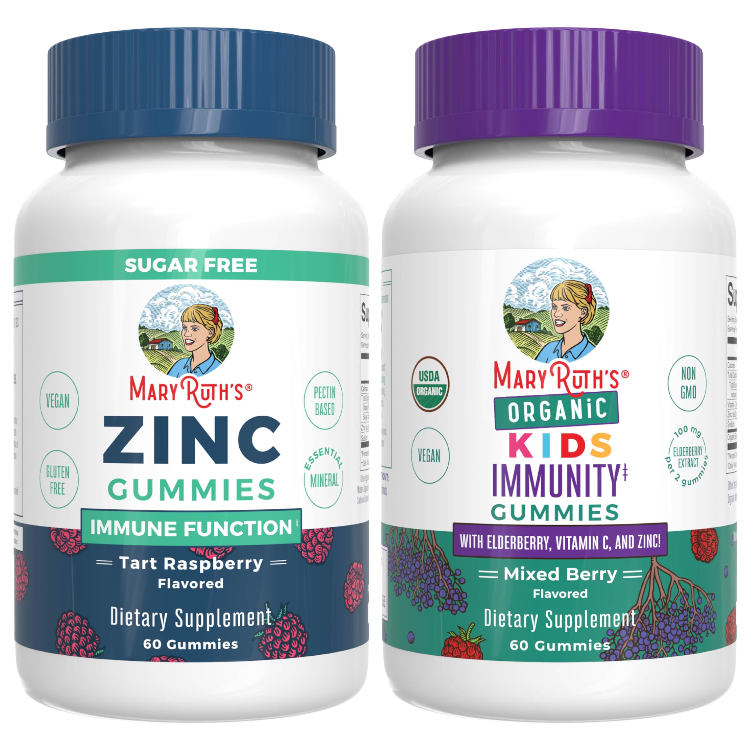 A Formula You Can Trust: MaryRuth's Zinc Gummies (Tart Raspberry) Kids Immunity Gummies (Mixed Berry) are B Corp Certified and Clean Label Project Verified Zinc Gummies: Optimal zinc levels are essential for immune health, supporting macrophages, a key component of your body's innate immune system. Kids Immunity Gummies: USDA Organic vitamin C, zinc, and elderberry gummies support children's immunity in a tasty mixed-berry flavor! Adult Zinc Gummies: Zinc is a trace mineral that is important for the integrity of the immune system. As one of the most abundant trace minerals in your body, zinc is present in all body tissues. Kids Immunity Gummies: Tasty USDA Organic vitamin C, zinc, and elderberry gummies made to support children's immunity! Supporting your child's immune system is important, and these organic, mixed-berry-flavored gummies are a delicious way to do so. Multiple Benefits: Zinc Gummies: Optimal zinc levels are crucial for immune health, supporting macrophages, a key part of your body's innate immune system. Kids Immunity Gummies: Vitamin C's antioxidant properties protect against free radicals, supporting immune health. Zinc, an essential trace mineral, is crucial for optimal immune function. For Most Lifestyles: Both products are Non-GMO, Vegan, Pectin Based, No Gelatin, Dairy Free, Nut Free, Gluten Free, Made in a GMP Facility Clean Label Project Verified, B Corp Certified. Zinc Gummies: Soy Free Kids Immune Support Gummies: USDA Organic, Formulated for kids ages 4 . Important: Our bundles may contain overlapping nutrients. Consult your physician to determine the right supplements and dosages for your health.For Most Lifestyles: Both products are Non-GMO, Vegan, Pectin Based, No Gelatin, Dairy Free, Nut Free, Gluten Free, Made in a GMP Facility Clean Label Project Verified, B Corp Certified. Zinc Gummies: Soy Free Kids Immune Support Gummies: USDA Organic, Formulated for kids ages 4 . Important: Our bundles may contain overlapping nutrients. Consult your physician to determine the right supplements and dosages for your health. Multiple Benefits: Zinc Gummies: Optimal zinc levels are crucial for immune health, supporting macrophages, a key part of your body's innate immune system. Kids Immunity Gummies: Vitamin C's antioxidant properties protect against free radicals, supporting immune health. Zinc, an essential trace mineral, is crucial for optimal immune function. Kids Immunity Gummies: Tasty USDA Organic vitamin C, zinc, and elderberry gummies made to support children's immunity! Supporting your child's immune system is important, and these organic, mixed-berry-flavored gummies are a delicious way to do so. Adult Zinc Gummies: Zinc is a trace mineral that is important for the integrity of the immune system. As one of the most abundant trace minerals in your body, zinc is present in all body tissues. A Formula You Can Trust: MaryRuth's Zinc Gummies (Tart Raspberry) Kids Immunity Gummies (Mixed Berry) are B Corp Certified and Clean Label Project Verified Zinc Gummies: Optimal zinc levels are essential for immune health, supporting macrophages, a key component of your body's innate immune system. Kids Immunity Gummies: USDA Organic vitamin C, zinc, and elderberry gummies support children's immunity in a tasty mixed-berry flavor!.