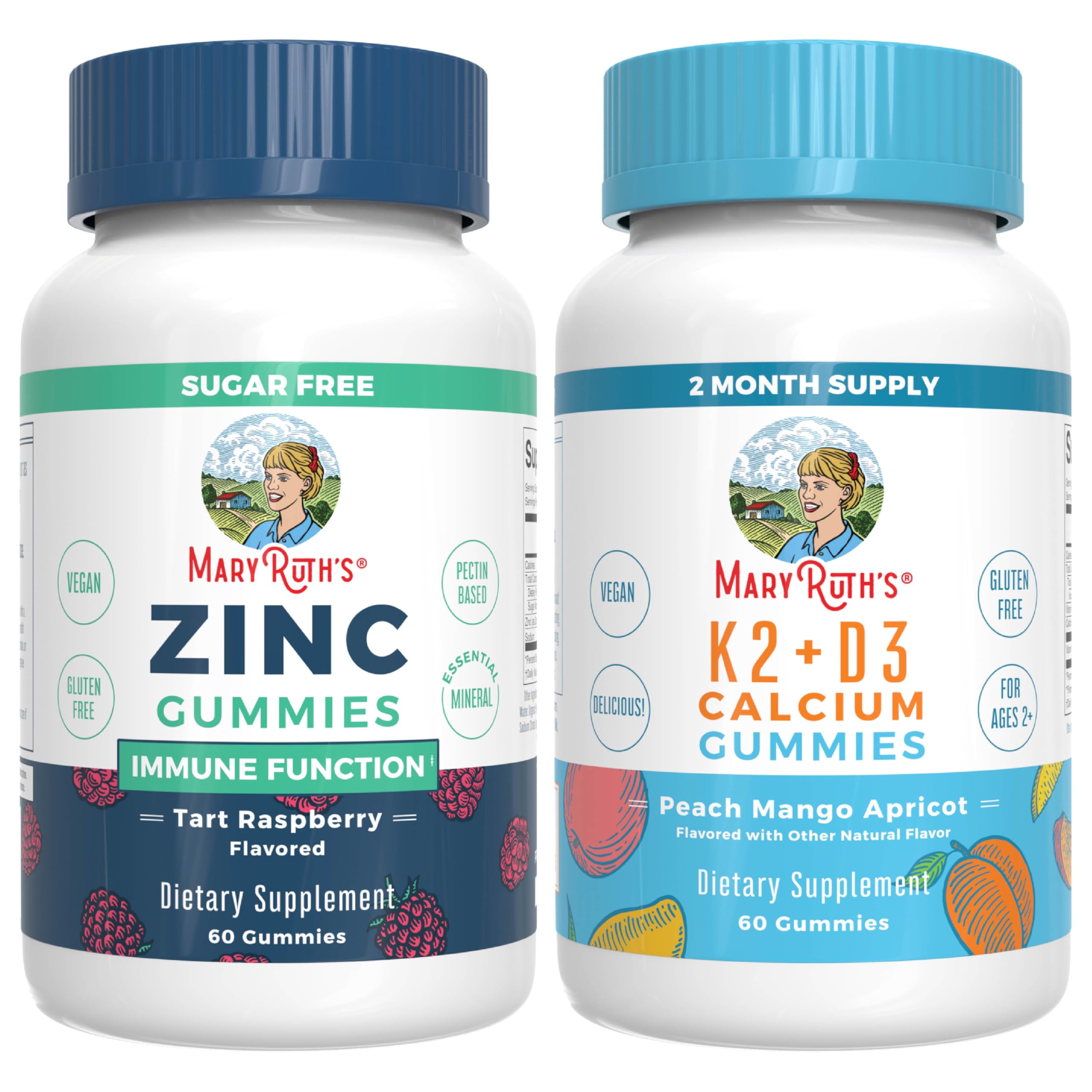 A Formula You Can Trust: MaryRuth's Zinc Gummies (Tart Raspberry) Vitamin K2 D3 Calcium Gummies (Peach Mango Apricot) are B Corp Certified and Clean Label Project Verified Zinc Gummies: Optimal zinc levels are essential for immune health, supporting macrophages, a key component of your body's innate immune system. Calcium Gummies: Support bone and joint health with these gummies! Vitamins D3 and K2 work together to enhance calcium absorption for stronger bones! Adult Zinc Gummies: Zinc is a trace mineral that is important for the integrity of the immune system. As one of the most abundant trace minerals in your body, zinc is present in all body tissues. Vitamin D3 K2 Calcium Gummies: Our delicious gummies have three flavors in one bottle: Peach, Mango Apricot, and are made from lichen and natto. Very few foods in nature contain vitamin D and most D3 supplements are sourced from lanolin — the fat of lamb's wool ours is sourced from lichen. Multiple Benefits: Zinc Gummies: Optimal zinc levels are crucial for immune health, supporting macrophages, a key part of your body's innate immune system. Calcium Gummies: Support bone and joint health with these gummies! Vitamins D3 and K2 enhance calcium absorption, aiding bone health without excess calcium. For Most Lifestyles: Both products are Non-GMO, Vegan, Pectin Based, No Gelatin, Dairy Free, Nut Free, Gluten Free, Made in a GMP Facility Clean Label Project Verified B Corp Certified Zinc Gummies: Soy Free. K2 D3 Calcium Gummies: Made with Organic Cane Sugar, Kid Friendly. Important: Our bundles may contain overlapping nutrients. Consult your physician to determine the right supplements and dosages for your health.For Most Lifestyles: Both products are Non-GMO, Vegan, Pectin Based, No Gelatin, Dairy Free, Nut Free, Gluten Free, Made in a GMP Facility Clean Label Project Verified B Corp Certified Zinc Gummies: Soy Free. K2 D3 Calcium Gummies: Made with Organic Cane Sugar, Kid Friendly. Important: Our bundles may contain overlapping nutrients. Consult your physician to determine the right supplements and dosages for your health. Multiple Benefits: Zinc Gummies: Optimal zinc levels are crucial for immune health, supporting macrophages, a key part of your body's innate immune system. Calcium Gummies: Support bone and joint health with these gummies! Vitamins D3 and K2 enhance calcium absorption, aiding bone health without excess calcium. Vitamin D3 K2 Calcium Gummies: Our delicious gummies have three flavors in one bottle: Peach, Mango Apricot, and are made from lichen and natto. Very few foods in nature contain vitamin D and most D3 supplements are sourced from lanolin — the fat of lamb's wool ours is sourced from lichen. Adult Zinc Gummies: Zinc is a trace mineral that is important for the integrity of the immune system. As one of the most abundant trace minerals in your body, zinc is present in all body tissues. A Formula You Can Trust: MaryRuth's Zinc Gummies (Tart Raspberry) Vitamin K2 D3 Calcium Gummies (Peach Mango Apricot) are B Corp Certified and Clean Label Project Verified Zinc Gummies: Optimal zinc levels are essential for immune health, supporting macrophages, a key component of your body's innate immune system. Calcium Gummies: Support bone and joint health with these gummies! Vitamins D3 and K2 work together to enhance calcium absorption for stronger bones!.