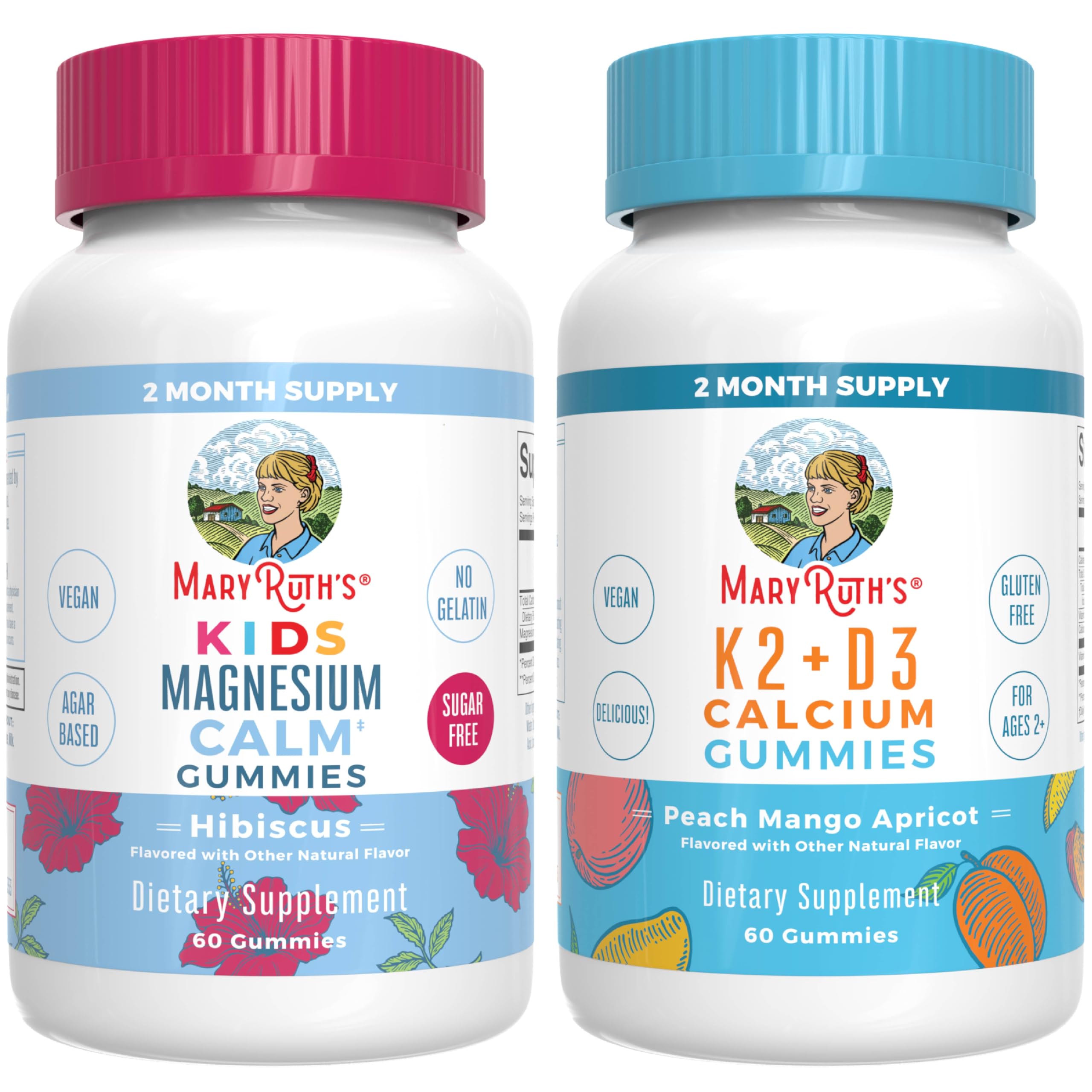 A Formula You Can Trust: MaryRuth's Gummies–Kids' Magnesium Calm (Hibiscus) Vitamin K2 D3 Gummies (Peach Mango Apricot) are B Corp Certified and Clean Label Project Verified! Kids Magnesium Calm Gummies: Natural hibiscus-flavored gummies to support calm and sleep for kids 2 . Vitamin D3 K2 Calcium Gummies: Plant-based support for bone health in tasty peach mango apricot flavors! Kids Magnesium Calm Gummies: Delicious natural hibiscus-flavored magnesium gummies that your kids will love! Support calm with this magnesium citrate sleep supplement for kids 2 and over. Vitamin D3 K2 Calcium Gummies: Our delicious gummies have three flavors in one bottle: Peach, Mango Apricot, and are made from lichen and natto. Very few foods in nature contain vitamin D and most D3 supplements are sourced from lanolin — the fat of lamb's wool ours is sourced from lichen. Multiple Benefits: D3 K2 Gummies: These gummy vitamins with D3 and K2 boost calcium absorption, supporting bone and joint health effectively. Magnesium Calm Gummies: These gummies may support muscle and bone function, calcium absorption, rest, and relaxation! For Most Lifestyles: Both products are Non-GMO, Vegan, Dairy Free, Nut Free, Gluten Free, No Gelatin, Made in a GMP Facility Clean Label Project Verified, B Corp Certified. Kids Magnesium Gummies: No Gelatin, Agar-Based, Soy Free, Sugar Free. K2 D3 Calcium Gummies: No Gelatin, Pectin-Based, Kid Friendly, Made with Organic Cane Sugar. Important: Our bundles may contain overlapping nutrients. Consult your physician to determine the right supplements and dosages for your health.For Most Lifestyles: Both products are Non-GMO, Vegan, Dairy Free, Nut Free, Gluten Free, No Gelatin, Made in a GMP Facility Clean Label Project Verified, B Corp Certified. Kids Magnesium Gummies: No Gelatin, Agar-Based, Soy Free, Sugar Free. K2 D3 Calcium Gummies: No Gelatin, Pectin-Based, Kid Friendly, Made with Organic Cane Sugar. Important: Our bundles may contain overlapping nutrients. Consult your physician to determine the right supplements and dosages for your health. Multiple Benefits: D3 K2 Gummies: These gummy vitamins with D3 and K2 boost calcium absorption, supporting bone and joint health effectively. Magnesium Calm Gummies: These gummies may support muscle and bone function, calcium absorption, rest, and relaxation!. Vitamin D3 K2 Calcium Gummies: Our delicious gummies have three flavors in one bottle: Peach, Mango Apricot, and are made from lichen and natto. Very few foods in nature contain vitamin D and most D3 supplements are sourced from lanolin — the fat of lamb's wool ours is sourced from lichen. Kids Magnesium Calm Gummies: Delicious natural hibiscus-flavored magnesium gummies that your kids will love! Support calm with this magnesium citrate sleep supplement for kids 2 and over. A Formula You Can Trust: MaryRuth's Gummies–Kids' Magnesium Calm (Hibiscus) Vitamin K2 D3 Gummies (Peach Mango Apricot) are B Corp Certified and Clean Label Project Verified ! Kids Magnesium Calm Gummies: Natural hibiscus-flavored gummies to support calm and sleep for kids 2 ! Vitamin D3 K2 Calcium Gummies: Plant-based support for bone health in tasty peach mango apricot flavors!.