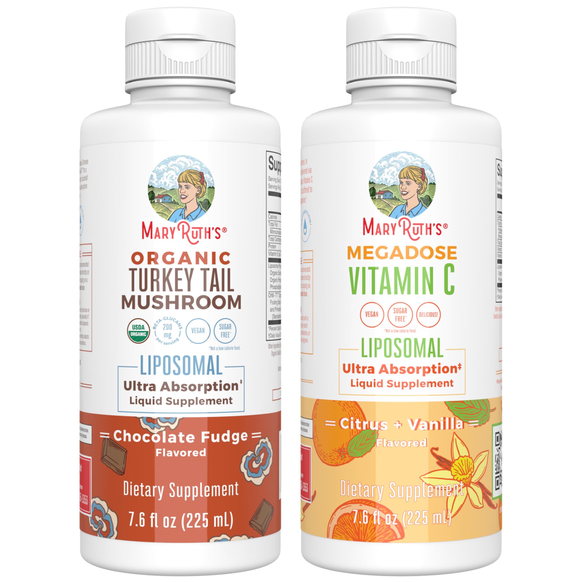 A Formula You Can Trust: MaryRuth's Turkey Tail Mushroom Liposomal (Chocolate Fudge) Vitamin C Liposomal (Citrus Vanilla) are B Corp Certified Clean Label Project Verified Mushroom Supplement: Our Turkey Tail supplement features OrMiu-TT, a full-spectrum product with all mushroom parts, grown using eco-friendly zero-waste practices. Vitamin C Liposomal: An antioxidant supplement that helps support immunity and overall health. Mushroom Supplement: If you're looking to supplement with Turkey Tail mushroom, our superhero supplement stars OrMiu-TT for a full-spectrum product with all the mushroom parts included! These mushrooms are grown with zero waste practices, making them good for the planet. Immune Support Supplement: Vitamin C is an essential vitamin that our body cannot produce on its own. Vitamin C is known for its antioxidant properties, which limit the damage done by free radicals while supporting immune function, wellbeing, and overall health. Multiple Benefits: Turkey Tail Mushroom: Get 1g of Organic Turkey Tail (Fruiting Body, Mycelium, Primordia) with 200mg Beta-Glucans per serving in this ultra-absorption liposomal Vitamin C: Advanced technology uses tiny liposomes to enhance bioavailability and ensure optimal vitamin C absorption. For Most Lifestyles: Both products are Non-GMO, Vegan, Dairy Free, Gluten Free, Soy Free, Sugar Free, Made in a GMP Facility No Artificial Colors, No MSG Clean Label Project Verified, B Corp Certified. Turkey Tail Mushroom Liposomal: Contains ALMONDS Vitamin C Liposomal: Nut Free. Important: Our bundles may contain overlapping nutrients. Consult your physician to determine the right supplements and dosages for your health.For Most Lifestyles: Both products are Non-GMO, Vegan, Dairy Free, Gluten Free, Soy Free, Sugar Free, Made in a GMP Facility No Artificial Colors, No MSG Clean Label Project Verified, B Corp Certified. Turkey Tail Mushroom Liposomal: Contains ALMONDS Vitamin C Liposomal: Nut Free. Important: Our bundles may contain overlapping nutrients. Consult your physician to determine the right supplements and dosages for your health. Multiple Benefits: Turkey Tail Mushroom: Get 1g of Organic Turkey Tail (Fruiting Body, Mycelium, Primordia) with 200mg Beta-Glucans per serving in this ultra-absorption liposomal Vitamin C: Advanced technology uses tiny liposomes to enhance bioavailability and ensure optimal vitamin C absorption. Immune Support Supplement: Vitamin C is an essential vitamin that our body cannot produce on its own. Vitamin C is known for its antioxidant properties, which limit the damage done by free radicals while supporting immune function, wellbeing, and overall health. Mushroom Supplement: If you're looking to supplement with Turkey Tail mushroom, our superhero supplement stars OrMiu-TT for a full-spectrum product with all the mushroom parts included! These mushrooms are grown with zero waste practices, making them good for the planet. A Formula You Can Trust: MaryRuth's Turkey Tail Mushroom Liposomal (Chocolate Fudge) Vitamin C Liposomal (Citrus Vanilla) are B Corp Certified Clean Label Project Verified Mushroom Supplement: Our Turkey Tail supplement features OrMiu-TT, a full-spectrum product with all mushroom parts, grown using eco-friendly zero-waste practices. Vitamin C Liposomal: An antioxidant supplement that helps support immunity and overall health.