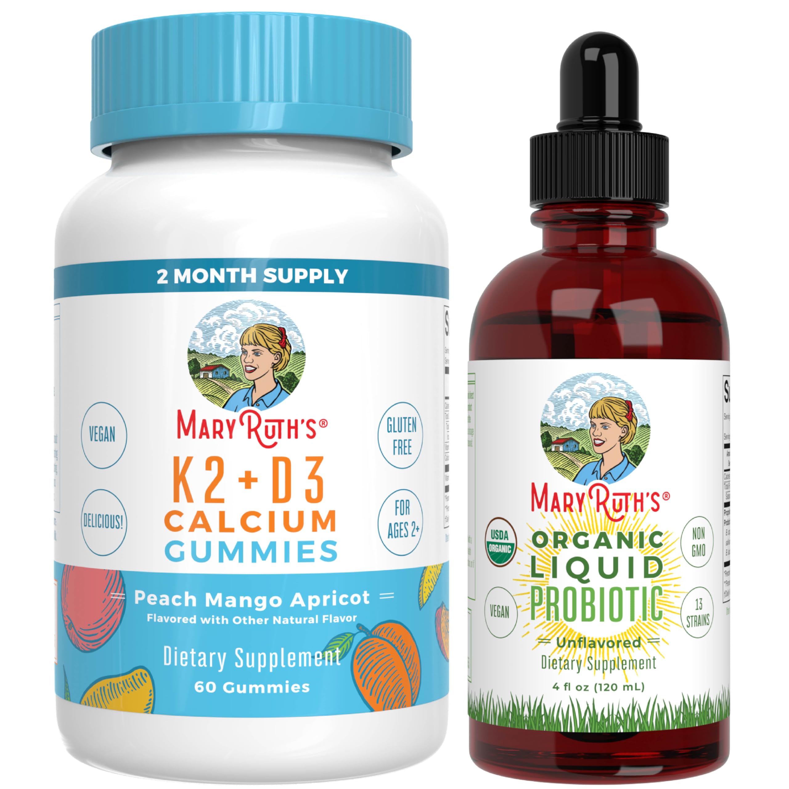 A Formula You Can Trust: MaryRuth's Vitamin K2 D3 Gummies (Peach Mango Apricot) and Probiotic Drops (Unflavored) are B Corp Certified and Clean Label Project Verified! Vitamin D3 K2 Calcium Gummies: Plant-based support for bone health in tasty peach, mango, and apricot flavors! Probiotic Drops (Unflavored): This USDA, vegan probiotic, with 13 unique strains and up to 2 billion CFU per serving, is formulated for ages 1 and suitable for the whole family! Vitamin D3 K2 Calcium Gummies: Our delicious gummies have three flavors in one bottle: Peach, Mango Apricot, and are made from lichen and natto. Very few foods in nature contain vitamin D and most D3 supplements are sourced from lanolin — the fat of lamb's wool ours is sourced from lichen. USDA Organic Liquid Probiotic: This vegan USDA Certified Organic Liquid Probiotic is formulated with 13 unique probiotic strains. Formulated for ages 1 , this probiotic for men, women, and kids can easily be dosed for the whole family! This proprietary probiotic blend contains up to 2 billion CFU per serving. "Multiple Benefits: D3 K2 Gummies: These gummy vitamins with D3 and K2 boost calcium absorption, supporting bone and joint health effectively. Probiotic Drops: Featuring Bacillus coagulans Unique IS-2, this spore-forming probiotic supports digestion, gut health, and immunity, while helping reduce occasional gas, bloating, and discomfort. " For Most Lifestyles: Both products are Non-GMO, Vegan, Dairy Free, Nut Free, Gluten Free, Made in a GMP Facility. Clean Label Project Verified, B Corp Certified. K2 D3 Calcium Gummies: No Gelatin, Pectin-Based, Kid Friendly, made with Organic Cane Sugar. Liquid Probiotic: USDA Organic, Soy Free, Sugar Free. Important: Our bundles may contain overlapping nutrients. Consult your physician to determine the right supplements and dosages for your health.For Most Lifestyles: Both products are Non-GMO, Vegan, Dairy Free, Nut Free, Gluten Free, Made in a GMP Facility. Clean Label Project Verified, B Corp Certified. K2 D3 Calcium Gummies: No Gelatin, Pectin-Based, Kid Friendly, made with Organic Cane Sugar. Liquid Probiotic: USDA Organic, Soy Free, Sugar Free. Important: Our bundles may contain overlapping nutrients. Consult your physician to determine the right supplements and dosages for your health. Multiple Benefits: D3 K2 Gummies: These gummy vitamins with D3 and K2 boost calcium absorption, supporting bone and joint health effectively. Probiotic Drops: Featuring Bacillus coagulans Unique IS-2, this spore-forming probiotic supports digestion, gut health, and immunity, while helping reduce occasional gas, bloating, and discomfort. USDA Organic Liquid Probiotic: This vegan USDA Certified Organic Liquid Probiotic is formulated with 13 unique probiotic strains. Formulated for ages 1 , this probiotic for men, women, and kids can easily be dosed for the whole family! This proprietary probiotic blend contains up to 2 billion CFU per serving. Vitamin D3 K2 Calcium Gummies: Our delicious gummies have three flavors in one bottle: Peach, Mango Apricot, and are made from lichen and natto. Very few foods in nature contain vitamin D and most D3 supplements are sourced from lanolin — the fat of lamb's wool ours is sourced from lichen. A Formula You Can Trust: MaryRuth's Vitamin K2 D3 Gummies (Peach Mango Apricot) and Probiotic Drops (Unflavored) are B Corp Certified and Clean Label Project Verified! Vitamin D3 K2 Calcium Gummies: Plant-based support for bone health in tasty peach, mango, and apricot flavors! Probiotic Drops (Unflavored): This USDA, vegan probiotic, with 13 unique strains and up to 2 billion CFU per serving, is formulated for ages 1 and suitable for the whole family!.