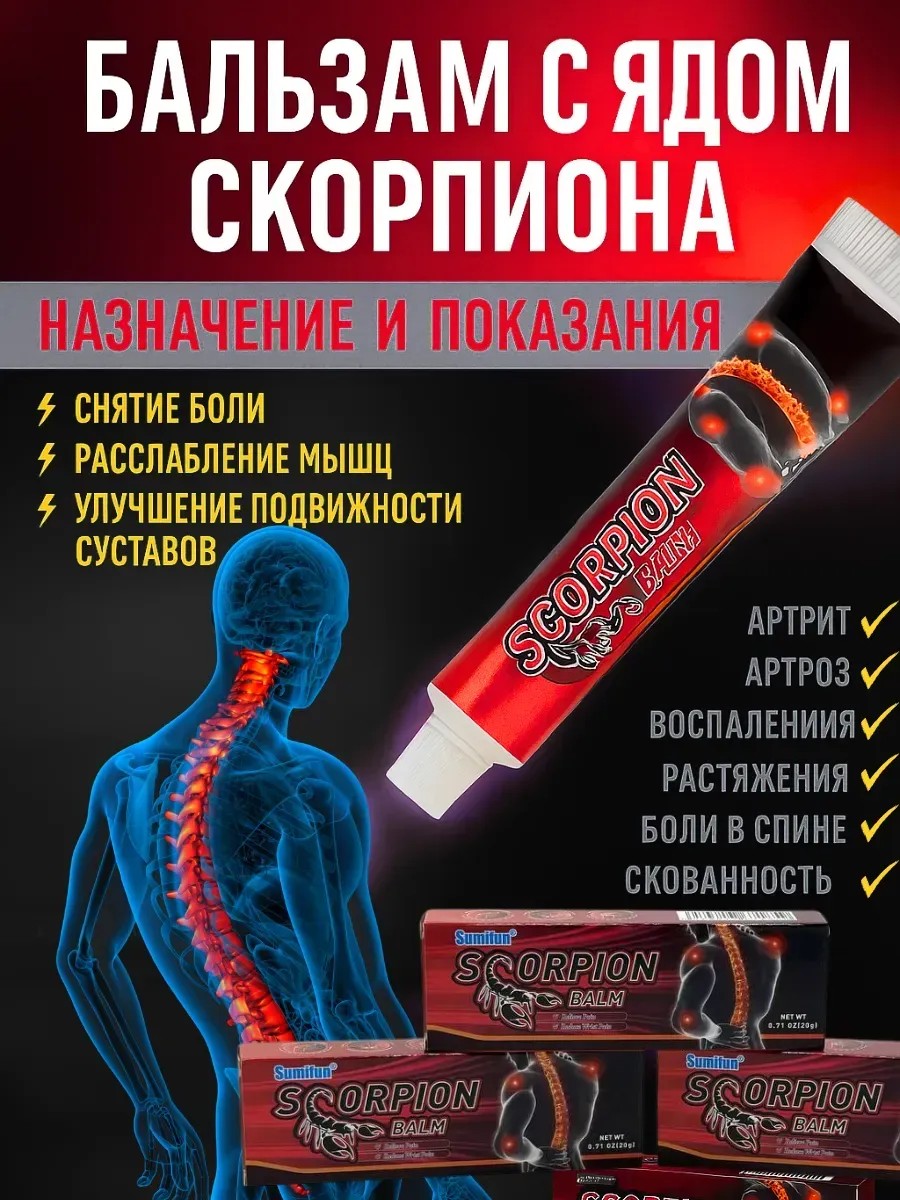 Мощный бальзам от боли в суставах, мышцах и спине! Мазь обезболивающий — это эффективное средство на основе яда скорпиона, специально разработанное для облегчения боли, снятия воспаления и восстановления подвижности. Этот лечебный бальзам активно используется при артрите, остеохондрозе, радикулите, ревматизме, растяжениях и ушибах. Уникальная формула обеспечивает локальное разогревание и глубокое проникновение в ткани, устраняя причину боли, а не только симптомы.