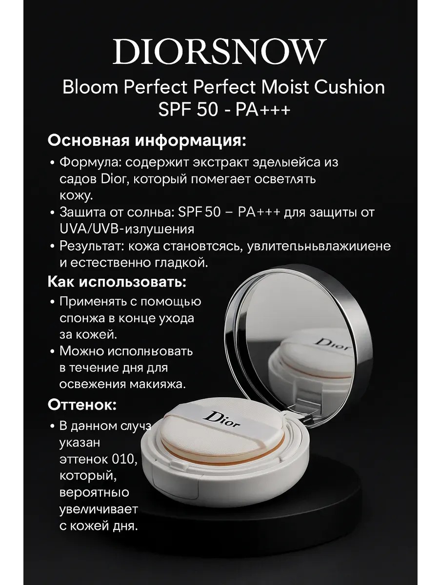 Инновационная формула содержит экстракт эдельвейса, выращенного в собственных садах Dior. Этот ингредиент известен своими мощными антиоксидантными и осветляющими свойствами. Он помогает улучшить тон кожи, выровнять текстуру и уменьшить видимость пигментации. В сочетании с ультра-лёгкой текстурой, кушон буквально сливается с кожей, создавая невесомое покрытие, которое маскирует несовершенства, покраснения, тусклость и следы усталости.