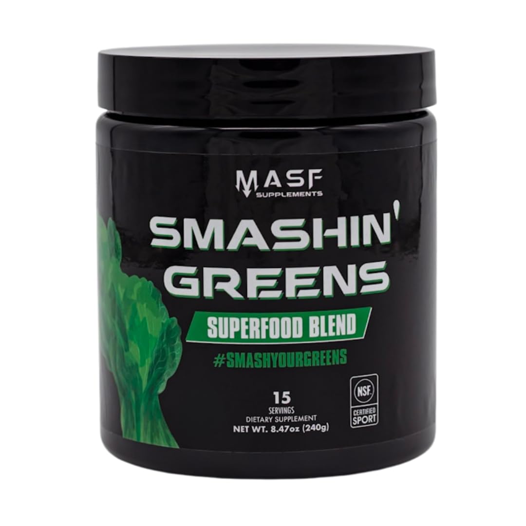 Introducing the Smashin' Greens Superfood Organic Blend by MASF Supplements, a nutrient-dense supplement designed to support your daily wellness routine. This NSF Certified for Sport supplement contains a powerful blend of organic superfoods, prebiotics, probiotics, and digestive enzymes, all working together to strengthen your immune system, promote gut health, and boost natural energy levels. Each serving provides 4.25 grams of Organic Wheat Grass, 2.25 grams of Organic Spirulina, and 2.25 grams of Organic Chlorella, delivering a plant-based, vegan, keto, and paleo-friendly source of essential nutrients.