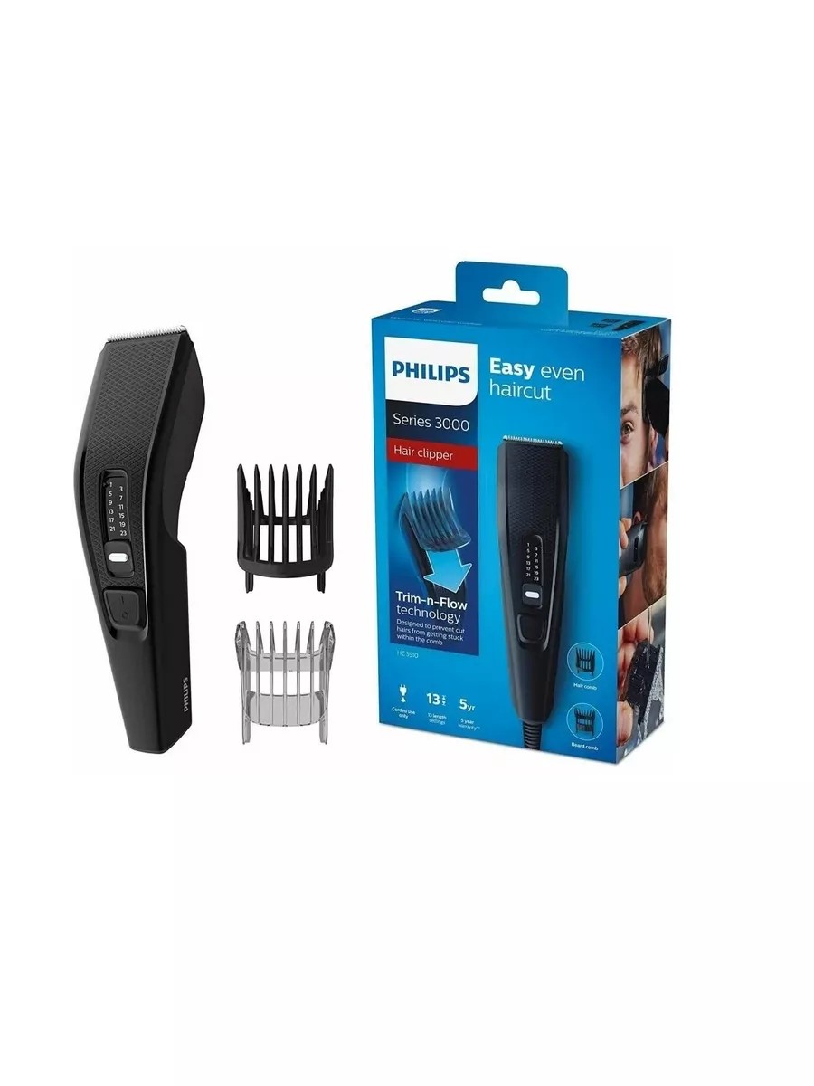 A flawless hairstyle without the hassle. Cut hair twice as fast with DualCut technology and self-sharpening blades. Trim-n-Flow technology prevents the comb from clogging: create your style without distraction. Select and lock one of 12 locking length settings on the adjustable comb: from 1 mm to 23 mm in 2 mm increments. Or use the appliance without a comb for a minimum length of 0.5 mm. A beard comb is included. The 1.8 m power cord ensures uninterrupted power supply. The Philips Series 3000 hair clipper is comfortable and easy to use. The special texture of the handle allows for easy control during cutting. The head opens with one click for easy cleaning of the removable blades. *Cuts 2 times faster: compared to the previous Philips model. 2-year warranty.