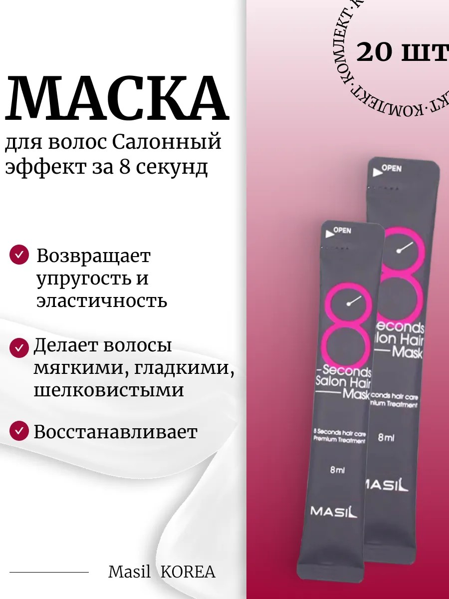 | Комплектация | Masil Комплект 20шт Маска для волос Салонный эффект за 8 секунд 8 Seconds Salon Hair Mask |