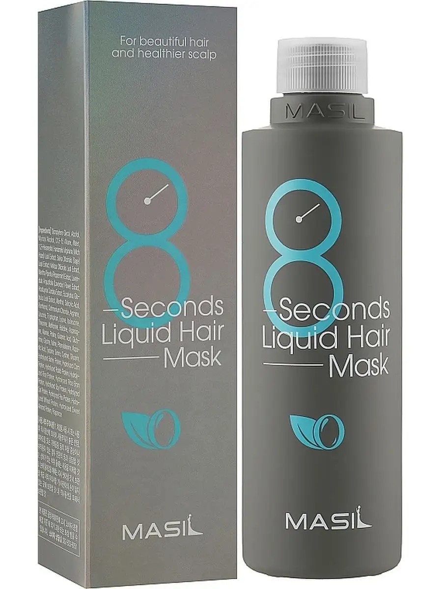 Masil 8 Seconds Salon Liquid Hair Mask - экспресс - маска для объема волос, в короткие сроки восстанавливает структуру волоса, укрепляет и возвращает здоровый блеск и сияние.Особенности корейской маски для волос:- придает волосам гладкость- облегчает расчесывание- предотвращает выпадению волос- придает волосам естественное сияние- придает волосам эластичность.Основные действующие компоненты маски для волос с салонным уходом за 8 секунд :Протеины шелка - придают волосам шелковистую мягкость, природную гладкость и эластичность, делают волосы послушными, облегчают расчёсывание, способствуют укладке и сохранению прически, защищают волосы от ультрафиолетового света.Пантенол - способствует росту новых волос, обеспечивает тщательное увлажнение кожи, поддерживает оптимальный уровень увлажненности на протяжении длительного времени.Гидролизированный коллаген - делает локоны более мягкими и эластичными, улучшает их структуру, предотвращает ломкость и выпадение, возвращает природное сияние.Комплекс аминокислот - эффективно восстанавливает волосы, улучшает их внешний вид, возвращает гладкость и блеск, создаёт защитную оболочку, которая удерживает влагу и придаёт волосам эластичность.Растительные экстракты - успокаивает раздраженную кожу, снимает процессы воспаления, устраняет неприятные ощущения и зуд.Способ применения: МАСКУ НЕОБХОДИМО РАЗВЕСТИ С ВОДОЙ 1:1, ПОЛУЧАЕТСЯ ПЕНКА БЕЛОГО ЦВЕТА, КОТОРУЮ НУЖНО НАНЕСТИ НА ВОЛОСЫ НА 2-3 МИНУТЫ, ЗАТЕМ СМЫТЬ ВОДОЙ. Оставьте минимум на 8 секунд, для более активного восстановления на 3-5 минут, мягко помассируйте и тщательно смойте теплой водой.Объем: 200 /100 мл.