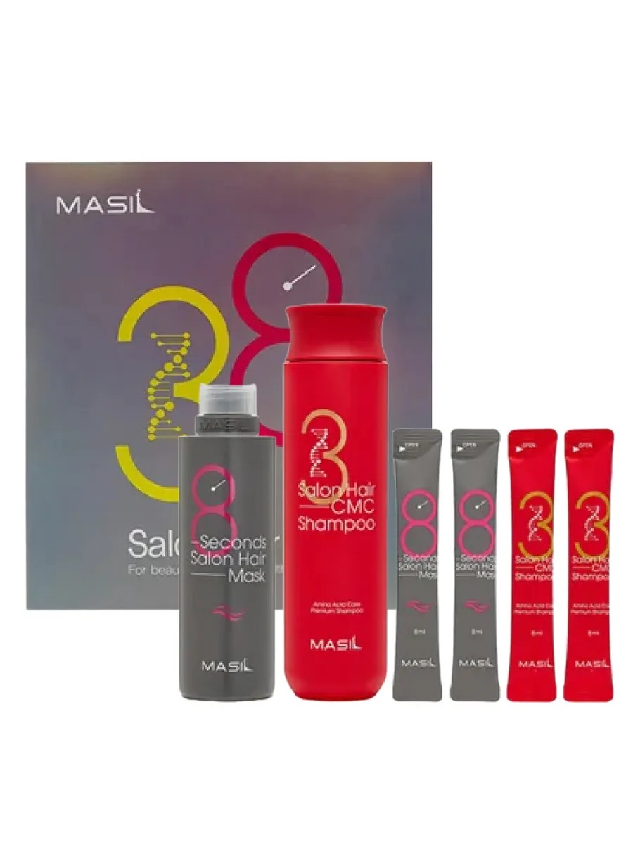 Masil 3 Salon Hair CMC Shampoo (300 мл + 2 саше по 8 мл) — шампунь с аминокислотами. Глубоко увлажняет волосы, не утяжеляя их, придает блеск, здоровый вид и способствует улучшению роста волос. Шампунь питает волосы, устраняет выпадение, обеспечивает гладкость и шелковистость. В состав входит 17 аминокислот, которые заполняют пористость волоса, делая их более плотными без утяжеления. Комплекс керамидов питает волосы, устраняет ломкость, препятствует появлению секущихся кончиков. Для всех типов волос.