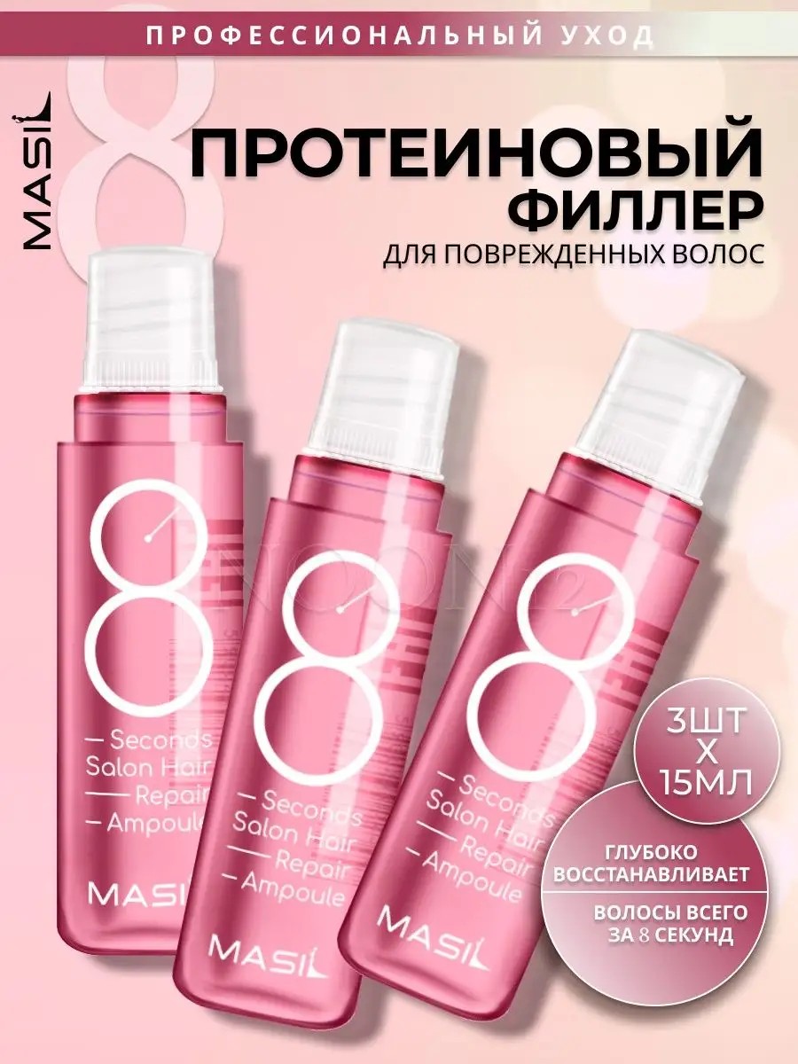Филлер сыворотка с коллагеном для поврежденных волос набор корея Masil 8 Seconds Salon Hair Repair Ampoule восстанавливающий от секущихся кончиков. Сыворотка для волос питает, защищает от жесткой воды. 10 растительных ПРОТЕИНОВ - восстанавливают и укрепляют, повышают плотность. Придают объем. АМИНОКИСЛОТЫ увлажняют кожу. Способствуют синтезу белка и коллагена. МЕНТОЛ антисептик, от жирного блеска, раздражений и воспалений. Гидролизованный КОЛЛАГЕН уплотняет волос, разглаживает кератиновые чешуйки. МАСЛО АВОКАДО и РАСТИТЕЛЬНЫЕ ЭКСТРАКТЫ - увлажняют кожу, снимают раздражения и шелушения, борются с перхотью.Для сухих, поврежденных и окрашенных волос. Выбор: 20,10 или 5 ампул по 15 мл. ПРИМЕНЕНИЕ: Смешайте с водой 1:1 до получения густой кремовой консистенции. Помойте голову шампунем, слегка подсушите волосы и равномерно нанесите средство по всей длине локонов. Для усиления - заверните волосы в полотенце или термошапку, прогрейте феном около 10 мин. Подождите 10 мин. Тщательно промойте водой