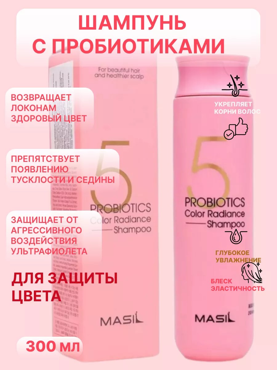 Masil 5 Probiotics Color Radiance Shampoo with probiotics for color protection restores healthy color, prevents dullness and graying, and protects against the harsh effects of ultraviolet radiation.