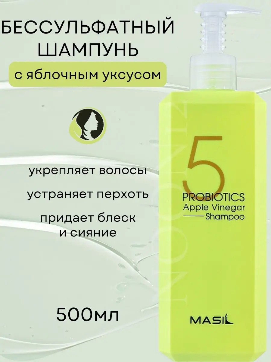 Мягкий бессульфатный шампунь женский MASIL 5 PROBIOTICS APPLE VINEGAR SHAMPOO для волос профессиональный с яблочным уксусом рекомендован для чувствительной кожи головы, которая реагирует на слишком активное очищение сухостью, перхотью, зудом и потерей блеска. Благодаря кислой реакции уксус закрывает кератиновые чешуйки и разглаживает волосы, придает блеск, ухаживает за кожей головы. Шампунь создан на базе мягких поверхностно-активных веществ. Они эффективно удаляют повседневные загрязнения, но при этом не раздражают кожу головы. Подходит для любого типа волос, для вьющихся волос, для жирных волос, для сухих волос, для окрашенных волос, для мелированных волос. Способ применения: нанесите шампунь на влажные волосы и кожу головы, мягко помассируйте 2-3 минуты и тщательно смойте теплой водой.
