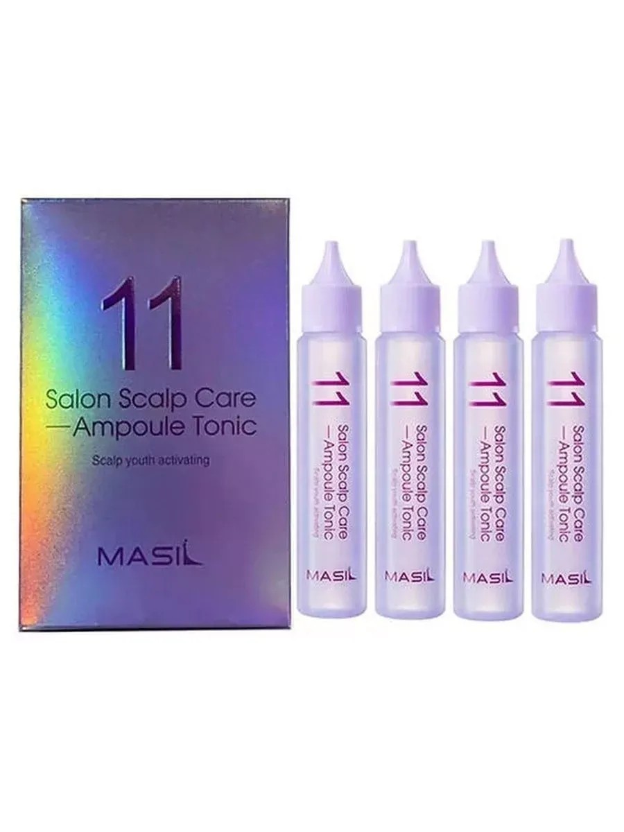 MASIL 11 SALON SCALP CARE AMPOULE TONIC Hair Serum. Masil 11 Salon Scalp Care Ampoule Tonic is an ampoule tonic designed exclusively for the scalp, providing freshness, vitality, and health to the scalp. This product is used when dry patches of the scalp or dead skin cells appear. It strengthens hair follicles and prevents hair loss. The tonic deeply moisturizes, normalizes the water-lipid balance, and prevents dryness and flaking. A complex of plant extracts deeply moisturizes, gives hair shine, and increases elasticity and density. HOW TO USE: Apply to problem areas when dry patches of the scalp or dead skin cells appear. Apply evenly to scalp cleansed with shampoo. Lightly massage in a circular motion with your fingertips and allow to absorb.