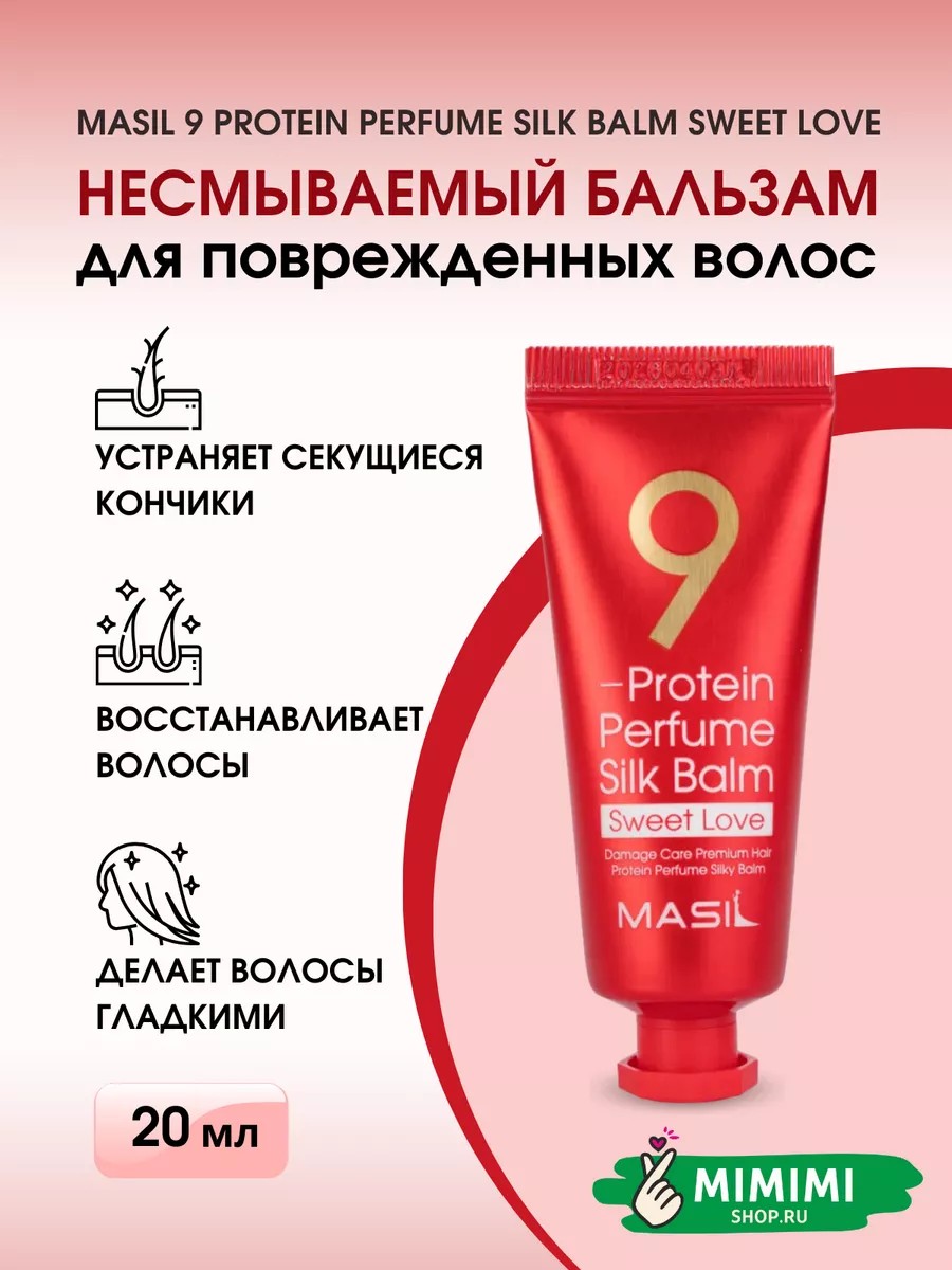 Несмываемый бальзам для поврежденных волос Masil 9 Protein Perfume Silk Balm Sweet Love сочетает в себе функции бальзама, восстанавливающей сыворотки и защитного продукта. Бальзам содержит ценные масла жожоба и макадамии, а также экстракты и протеины 20 растений. Формула обогащена кератином, шелком и коллагеном, особое значение имеет входящий в состав регенерирующий пептид, который воздействует на глубинные структуры волос и помогает устранить сухость, истончение и сечение кончиков. Сглаживает волосяные чешуйки, возвращая блеск, устраняет пушистость, создает защитный слой от негативного воздействия внешних факторов.