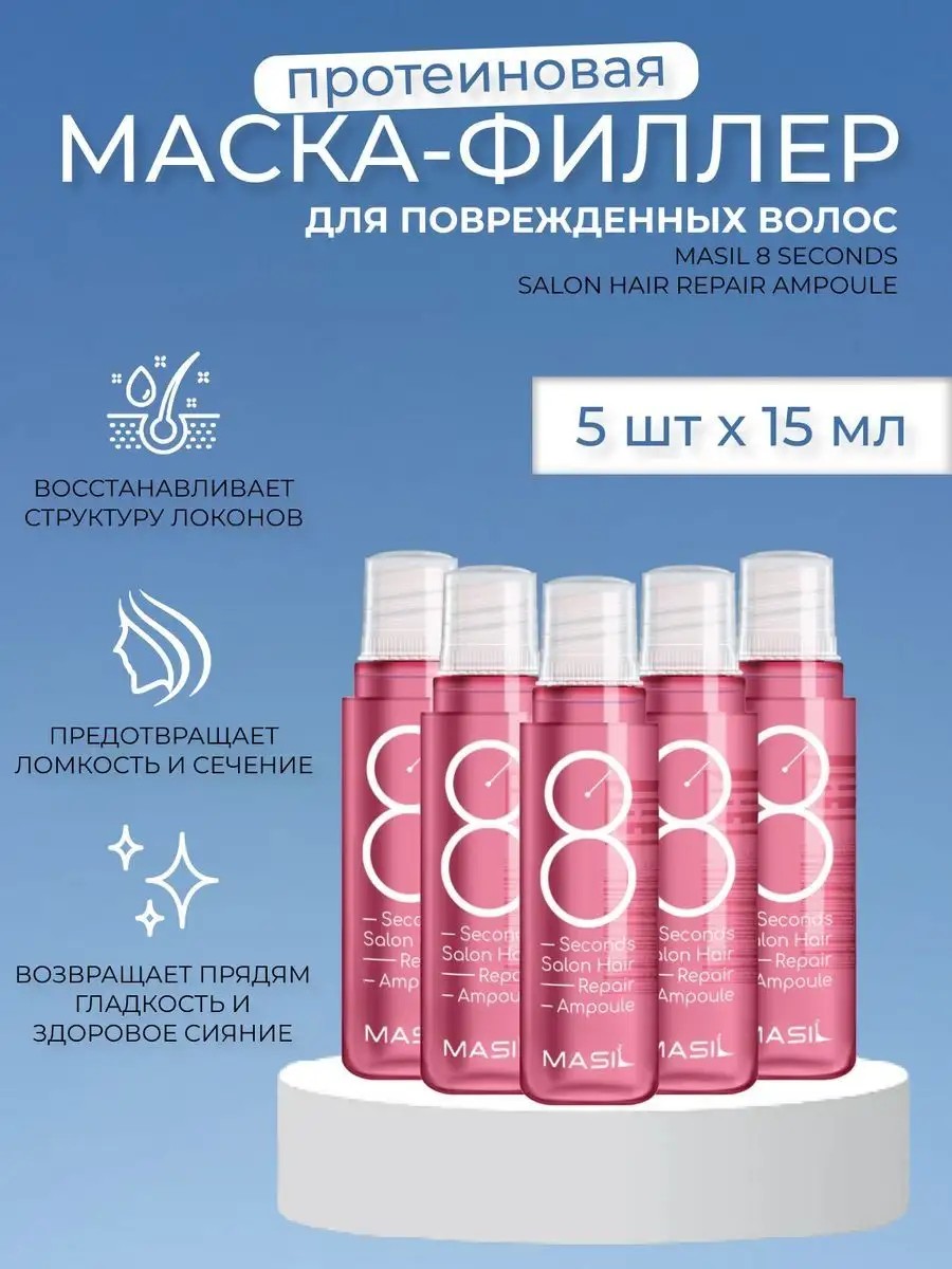 The Masil 8 Seconds Salon Hair Repair Ampoule protein filler mask for damaged hair deeply restores the structure of curls, prevents breakage and split ends, and restores smoothness and healthy shine.
