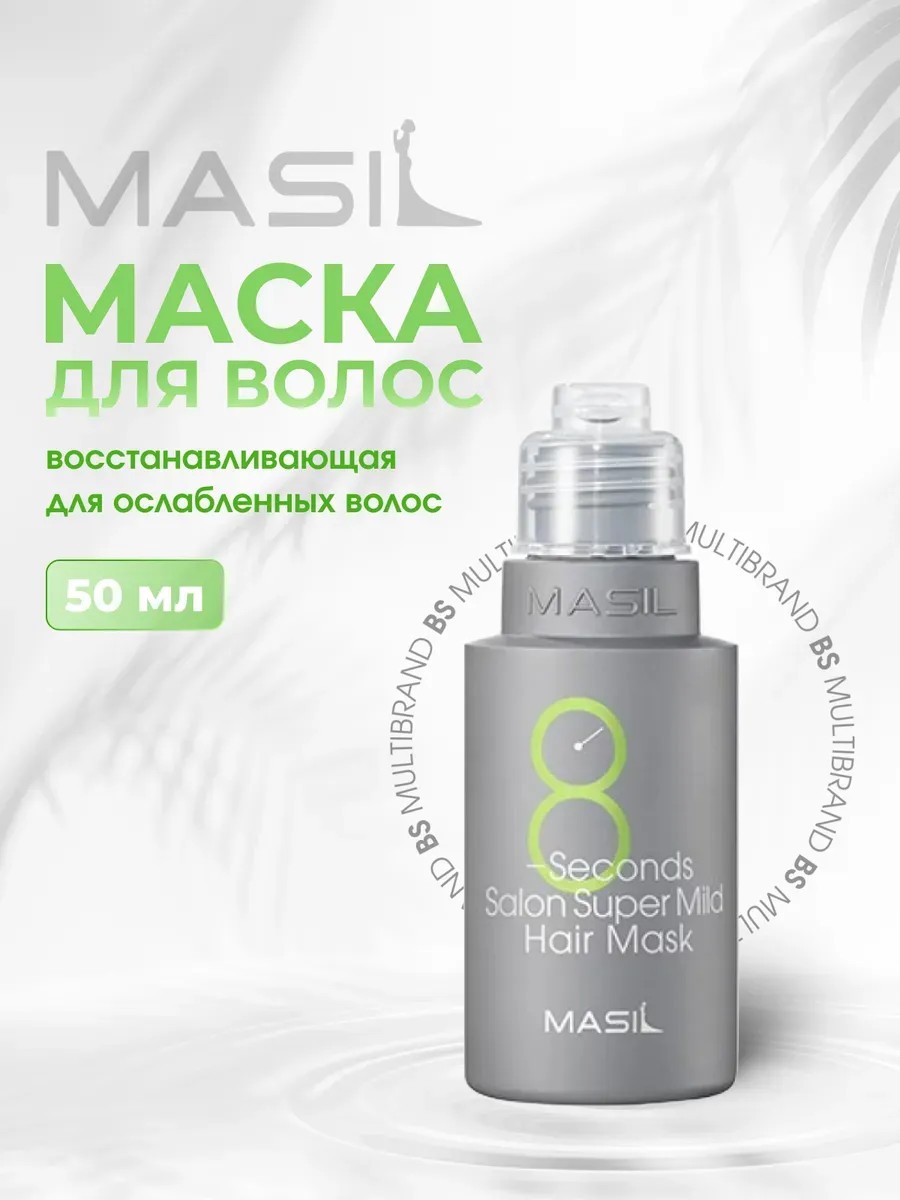 Маска для быстрого восстановления волос MASIL 8 Seconds Salon Hair Mask делает кудрявые, вьющиеся и секущиеся волосы мягкими, гладкими, шелковистыми и возвращает локонам здоровый блеск. Высококонцентрированная формула средства проникает глубоко в кутикулу волоса и положительно влияет на восстановление структуры прядей, возвращает пушистым волосам упругость и эластичность. Направлена на глубокое восстановление даже самых повреждённых волос. Профессиональное корейское средство также оздоравливает кожу головы, нормализует рН баланс кожи, уменьшает жирность, укрепляет корни и препятствует выпадению волос. Маска содержит 16 растительных ингредиентов таких как лакрица, зеленый чай, лаванда, лимон, центелла, апельсин, гинкго и другие экстракты, которые укрепляют тонкие волосы, делая их всегда шелковистыми и струящимися. Смываемый комплексный уход за волосами всего за 8 секунд способен интенсивно восстановить и значительно улучшить состояние прядей, вернуть силу и блеск волосам, укрепить их и устранить ломкость. Бальзам представляет собой прозрачную жидкую эссенцию, которая питает и увлажняет волос, для легкого расчесывания. Способ применения ухода за волосами: В неметаллической ёмкости необходимо смешать маску и воду в пропорции 1:1, чтобы водянистая консистенция превратилась в кремообразную. После мытья головы шампунем нанести маску на влажные волосы, отступив от корней несколько сантиметров, равномерно распределить по всей длине растирающими движениями, оставить на 8 секунд (при сильно повреждённых волосах маску рекомендуется держать 3-5 минут), затем смыть теплой водой. Маска прекрасно подойдет для окрашенных, осветленных, рыжих, мелированных, темных и седых волос. Поэтому рекомендуем присмотреться в качестве подарка для дочки, мамы, бабушки, подруги, а так же мужчины. Мини объем 50мл удобно взять в дорогу или как пробник.