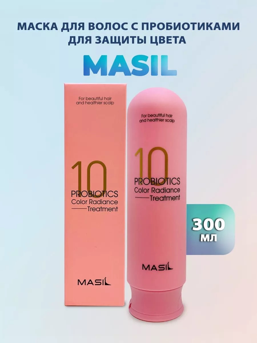 Masil 10 Probiotics Color Radiance Treatment. This color-protecting mask with probiotics restores healthy color to hair, prevents dullness and graying, and protects against the harsh effects of ultraviolet radiation. It gently strengthens hair roots, making strands smoother and silkier. It prevents hair fading caused by blow-drying and ultraviolet radiation, preserving the natural color. It strengthens the hair structure, eliminates breakage and tangling, and facilitates combing and styling. It forms an invisible protective layer, improves barrier function, and maintains optimal water-lipid balance. Directions: Apply the required amount evenly to hair, massaging in. Rinse thoroughly with warm water. Volume: 300 ml
