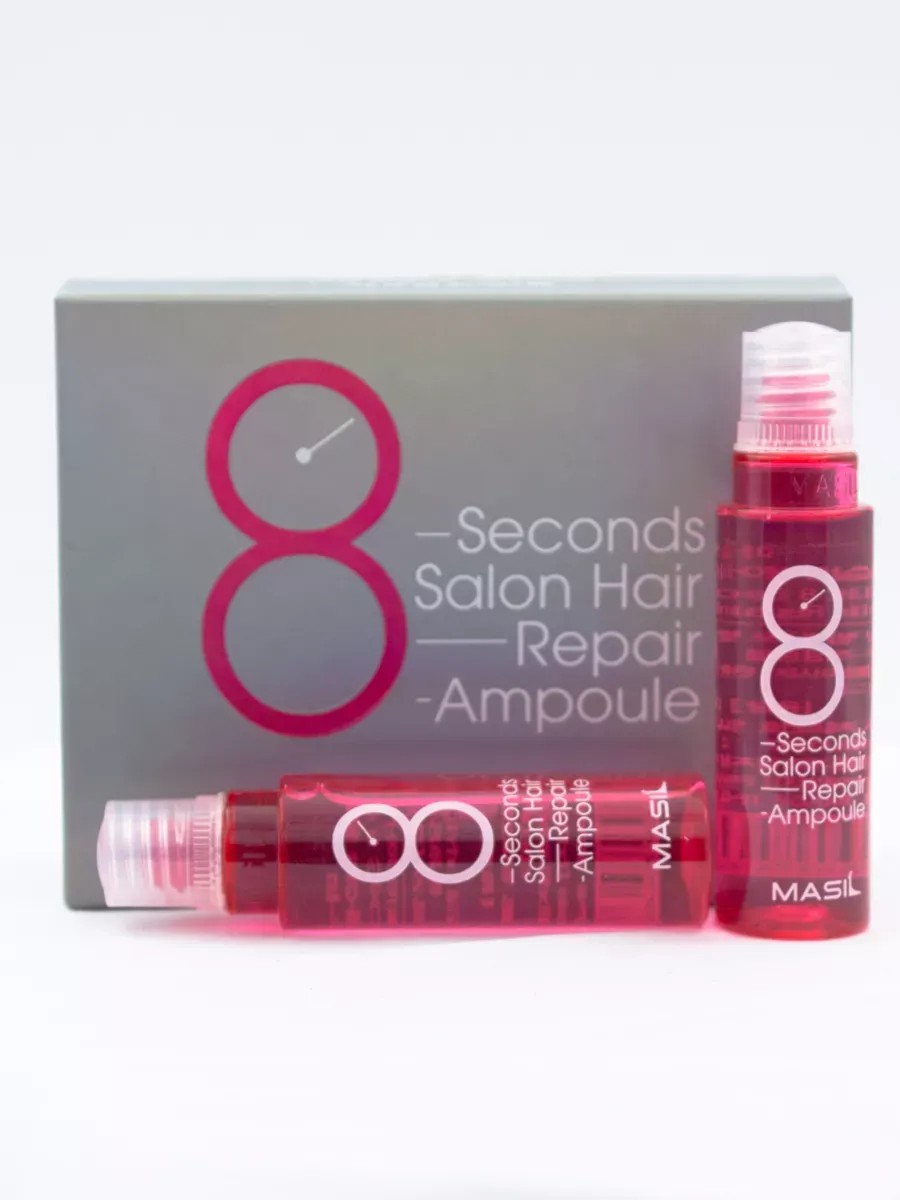 Masil 8 Seconds Salon Hair Repair Ampoule, a protein filler mask for damaged hair, deeply restores the structure of curls, prevents breakage and split ends, and restores smoothness and healthy shine.