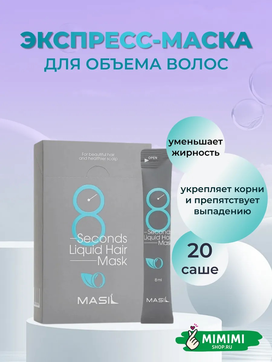 Экспресс - маска для объема волос Masil 8 Seconds Liquid Hair Mask в короткие сроки делает кудрявые, вьющиеся и секущиеся волосы мягкими, гладкими, шелковистыми и восстанавливает структуру волоса, укрепляет и возвращает здоровый блеск и сияние. Высококонцентрированная формула средства проникает глубоко в кутикулу волоса и положительно влияет на восстановление структуры волос. Направлена на глубокое восстановление даже самых повреждённых волос. Профессиональное корейское средство также оздоравливает кожу головы, нормализует рН баланс кожи, уменьшает жирность, укрепляет корни и препятствует выпадению волос. Маска содержит 16 растительных ингредиентов, которые укрепляют тонкие волосы, делая их всегда шелковистыми и струящимися. Смываемый комплексный уход за волосами всего за 8 секунд способен интенсивно восстановить и значительно улучшить состояние прядей, вернуть силу и блеск волосам, укрепить их и устранить ломкость. Бальзам представляет собой прозрачную жидкую эссенцию, которая питает и увлажняет волос, для легкого расчесывания. Способ применения ухода за волосами: В неметаллической ёмкости необходимо смешать маску и воду в пропорции 1:1, чтобы водянистая консистенция превратилась в кремообразную. После мытья головы шампунем нанести маску на влажные волосы, отступив от корней несколько сантиметров, равномерно распределить по всей длине растирающими движениями, оставить на 8 секунд (при сильно повреждённых волосах маску рекомендуется держать 3-5 минут), затем смыть теплой водой. Маска прекрасно подойдет для окрашенных, осветленных, рыжих, мелированных, темных и седых волос. Поэтому рекомендуем присмотреться в качестве подарка для дочки, мамы, бабушки, подруги, а так же мужчины. Мини объем в пакетиках удобно взять в дорогу или как пробник.