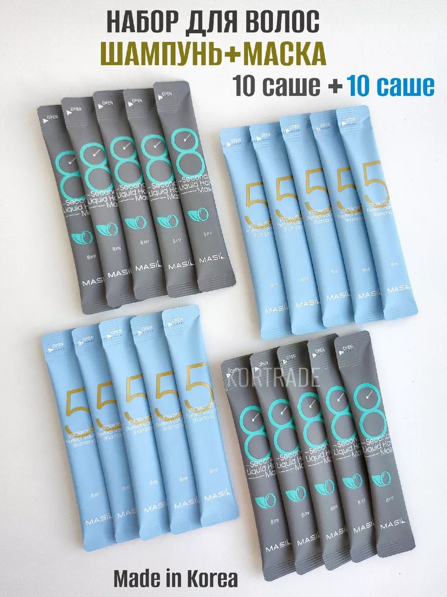 Дорожный набор по уходу за волосами от корейского бренда Masil, который включает в себя шампунь и маску для быстрого восстановления волос! Набор имеет формат саше, что удобно брать с собой в дорогу, в отпуск!