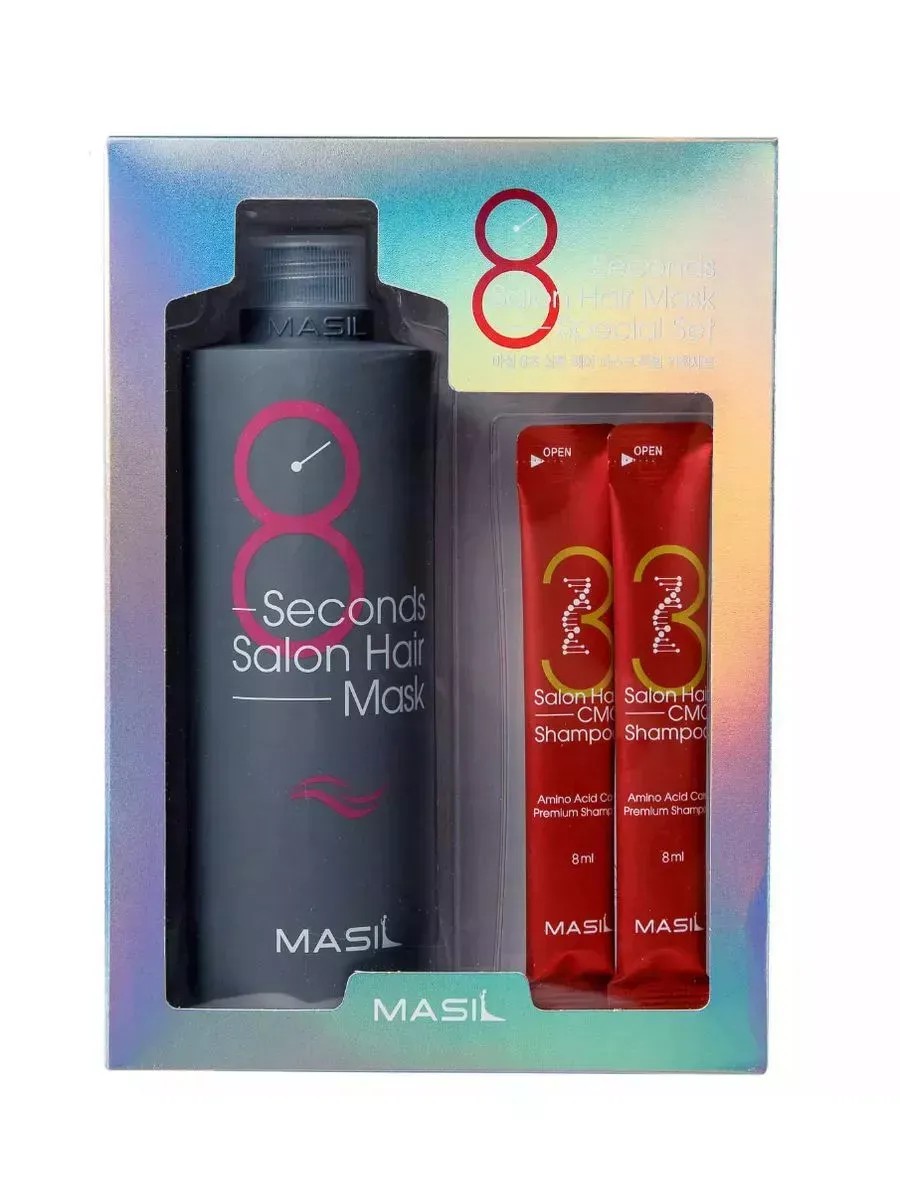 Masil 8 Seconds Salon Hair Mask Special Set (350 ml) for rapid hair restoration. This set includes a shampoo and mask for instant restoration of weakened, dull, and damaged hair. They restore vitality to curls, and give softness and silkiness to colored and bleached hair. Miniature sachets contain a complex of proteins, amino acids, ceramides, and natural oils. They completely transform hair while simultaneously caring for the scalp. The shampoo gently cleanses hair of dirt and sebum, moisturizes, and eliminates flaking and itching. Instantly fills voids in the structure, smoothes them, and restores shine and silkiness. The mask nourishes and strengthens hair, prevents dandruff and split ends, and relieves irritation and inflammation.