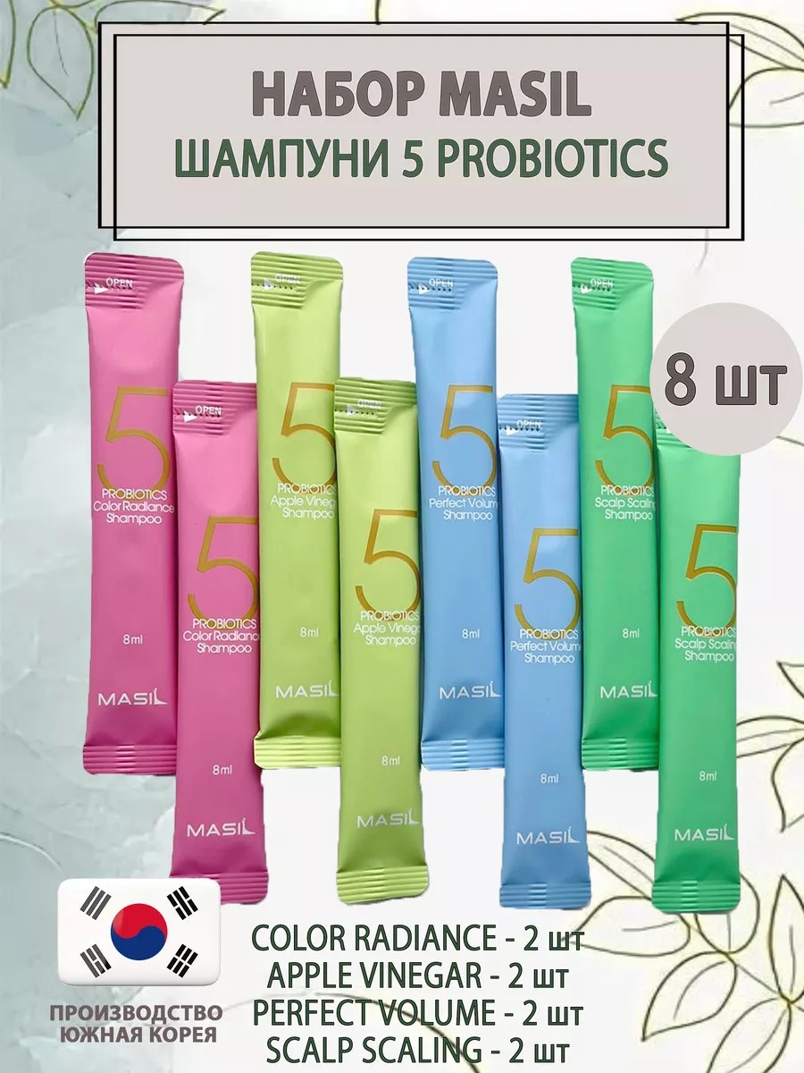 A set of mini versions of MASIL 5 Probiotic shampoos is a great way to try all the shampoos of the Korean brand Masil 5 Probiotics Shampoo.