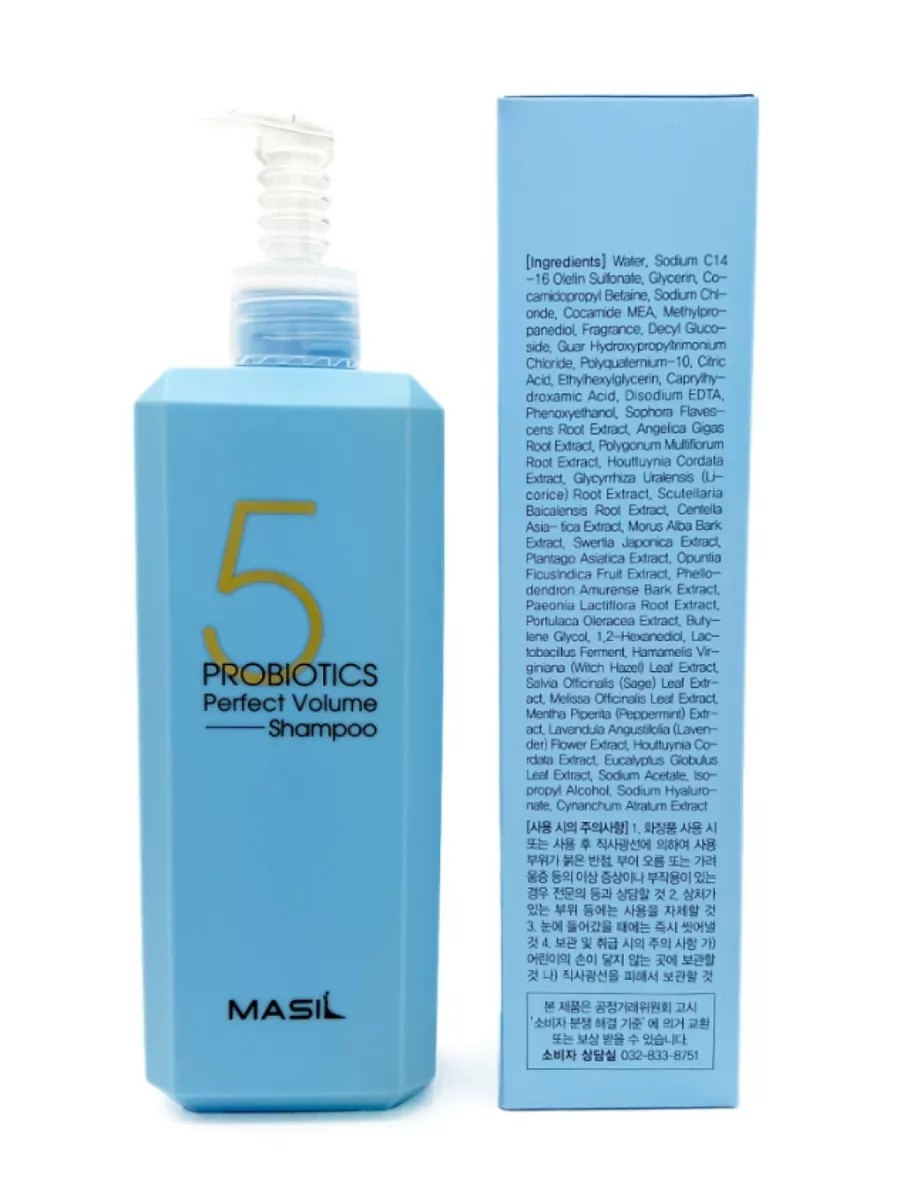 Masil 5 Probiotics Perfect Volume Shampoo, a shampoo for smooth, volumized hair, features five types of probiotics.