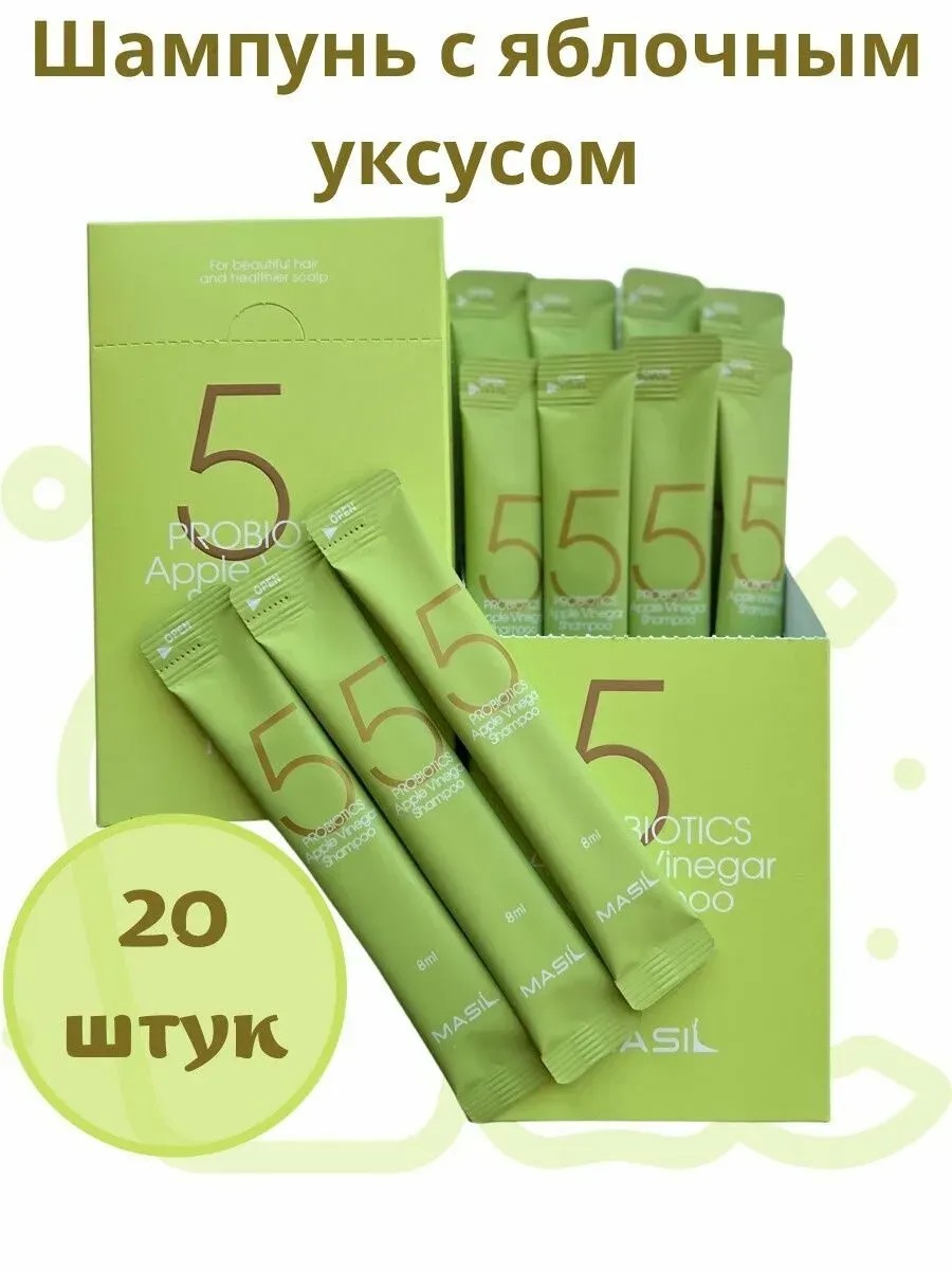 Шампунь Masil 5 Probiotics Apple Vinegar Shampoo Stick Pouch (объём 8 мл × 20 шт.) — средство против перхоти.