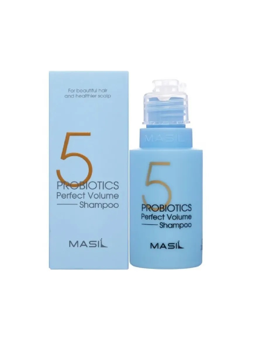 Masil, Шампунь для объема волос с пробиотиками - 5 probiotics perfect volume shampoo, 50 мл. Оживляет волосы, устраняет тусклость и возвращает прядям здоровый блеск, делает локоны шелковистыми и послушными. Регулирует работу сальных желез, снижает жирность кожи, бережно отшелушивает ороговевшие клетки. Шампунь укрепляет защитный слой и повышает барьерные функции клеток, способствуя удержанию влаги. Устраняет сухость и шелушения, оздоравливает микробиом кожи, усиливает приток питательных веществ к корням волос. Восстанавливает поврежденную структуру волоса, возвращает естественный объем, разглаживает кератиновые чешуйки. Шампунь приятно освежает кожу, образует обильную пену и легко смывается водой